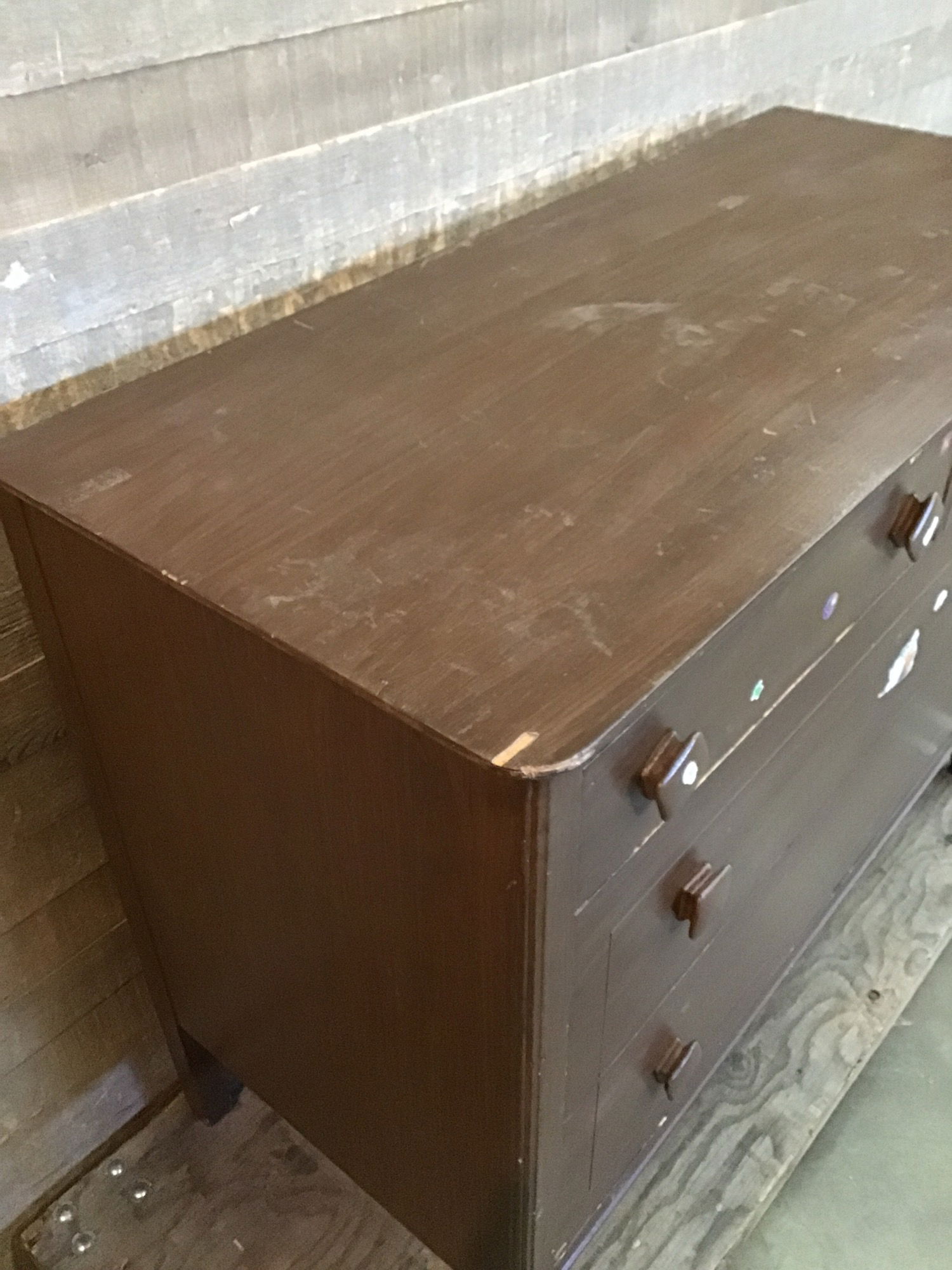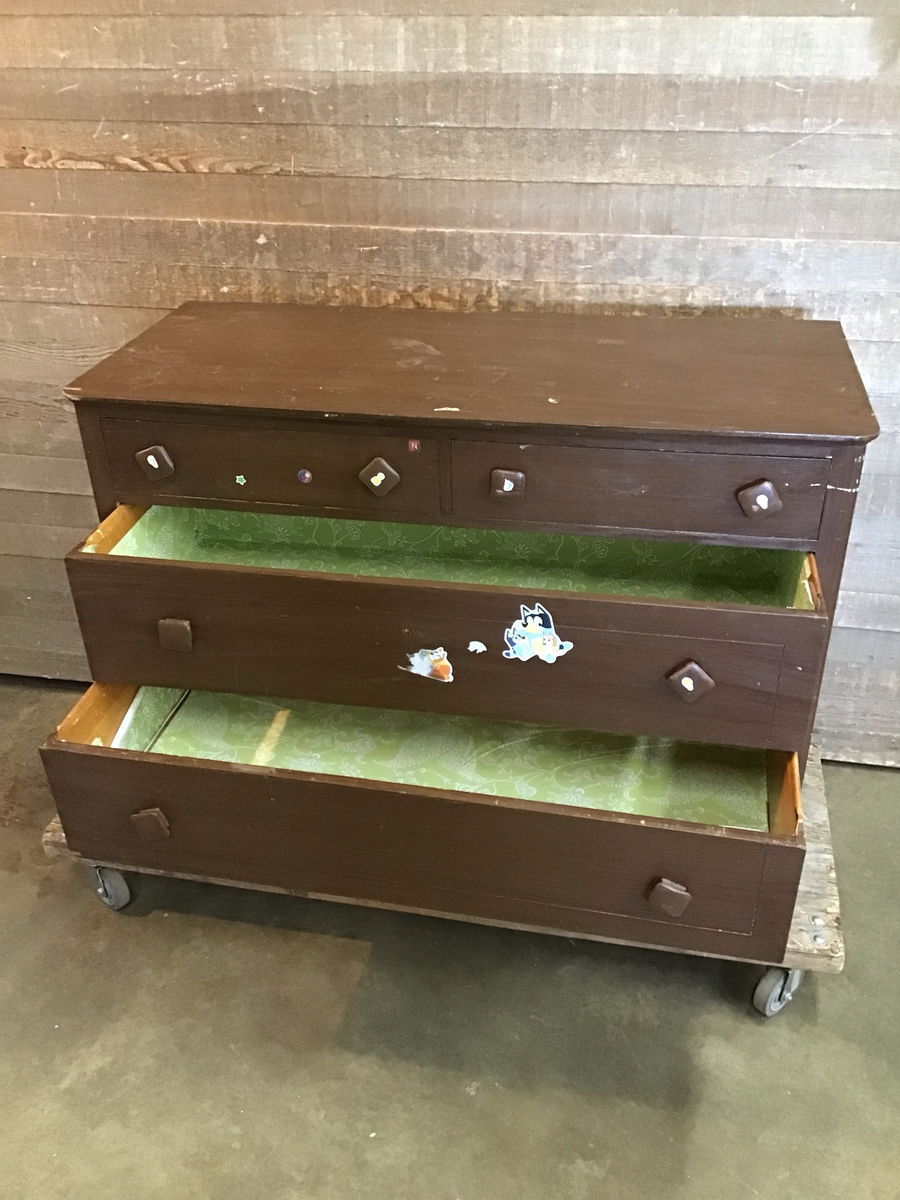 Simple wood dresser with four drawers made by Gregory Furniture Mfg. Co. The drawers have wooden knobs and move in and out fairly easily. There are a bunch of stickers stuck to it, and some minor cosmetic damage to the finish, but is overall solid. Great piece to refinish or repaint the color of your choice.