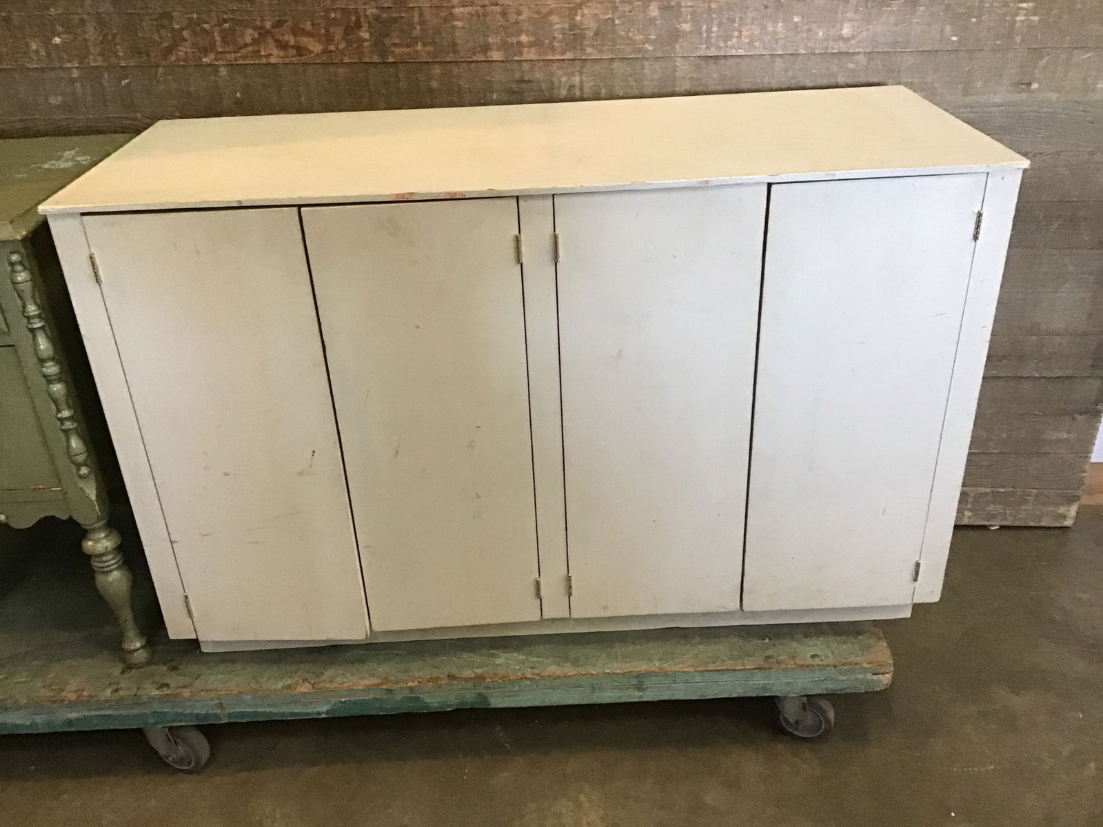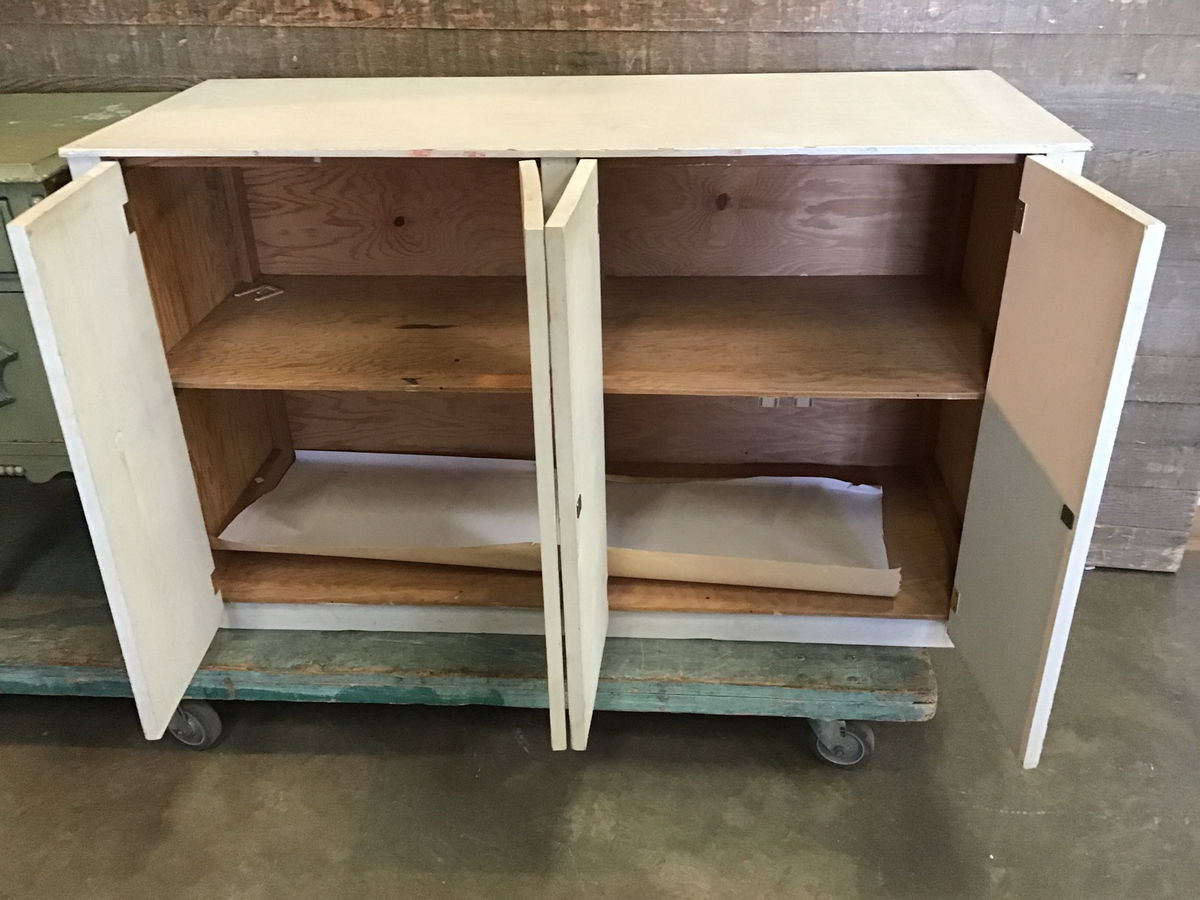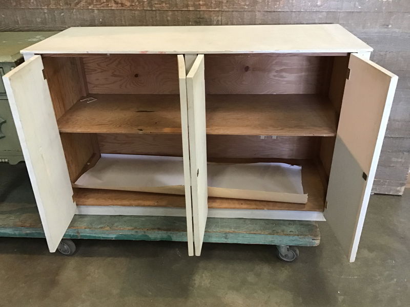 Handy shop cabinet with four doors and a fixed shelf. This has a plywood box and is in good, sturdy shape. The doors don't have any pulls or knobs, and one isn't closing flush and needs a lil work. Has been painted white. Great for a work shop or art studio to store tools or materials!