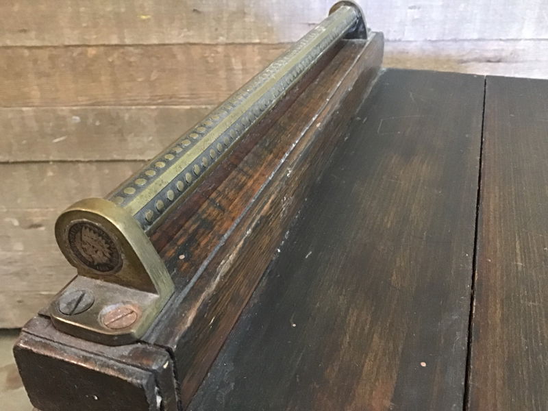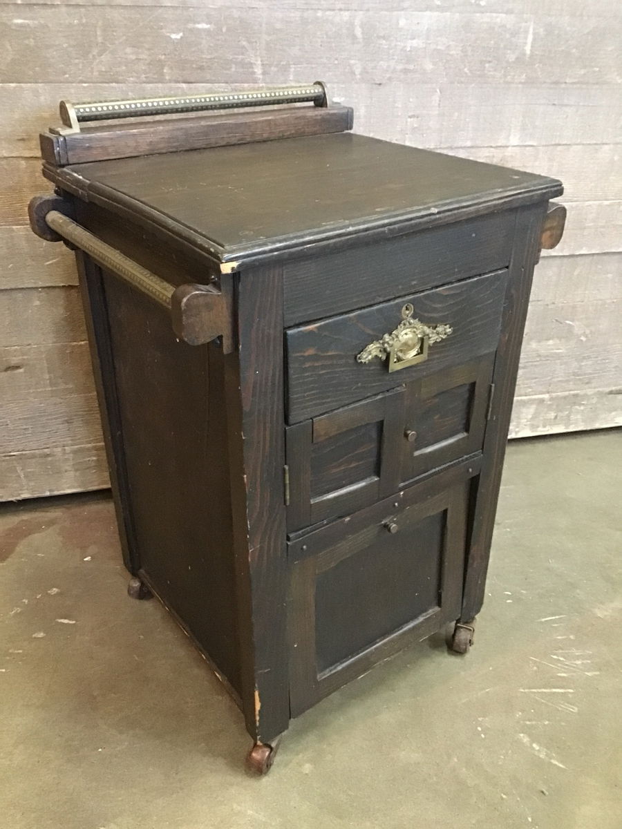 Super cool and very old little rolling table with stunning brass rods and little cubbies for storage. This looks to be made with a mix of woods, all stained a dark color. The three brass rods have a dotted pattern and the top one has antique coins pressed into the side. The little drawer has an ornate brass plate as well. The two door section is missing its little astragal piece that covers the seams when closed. The bottom door hinges from the bottom. The overall box is in good shape, though there is some wear to the thin panels on the sides and back. There is also a natural crack in the top that could be fixed with some wood glue and clamps. Not sure of it's original functionality, but this would be a great little statement piece.