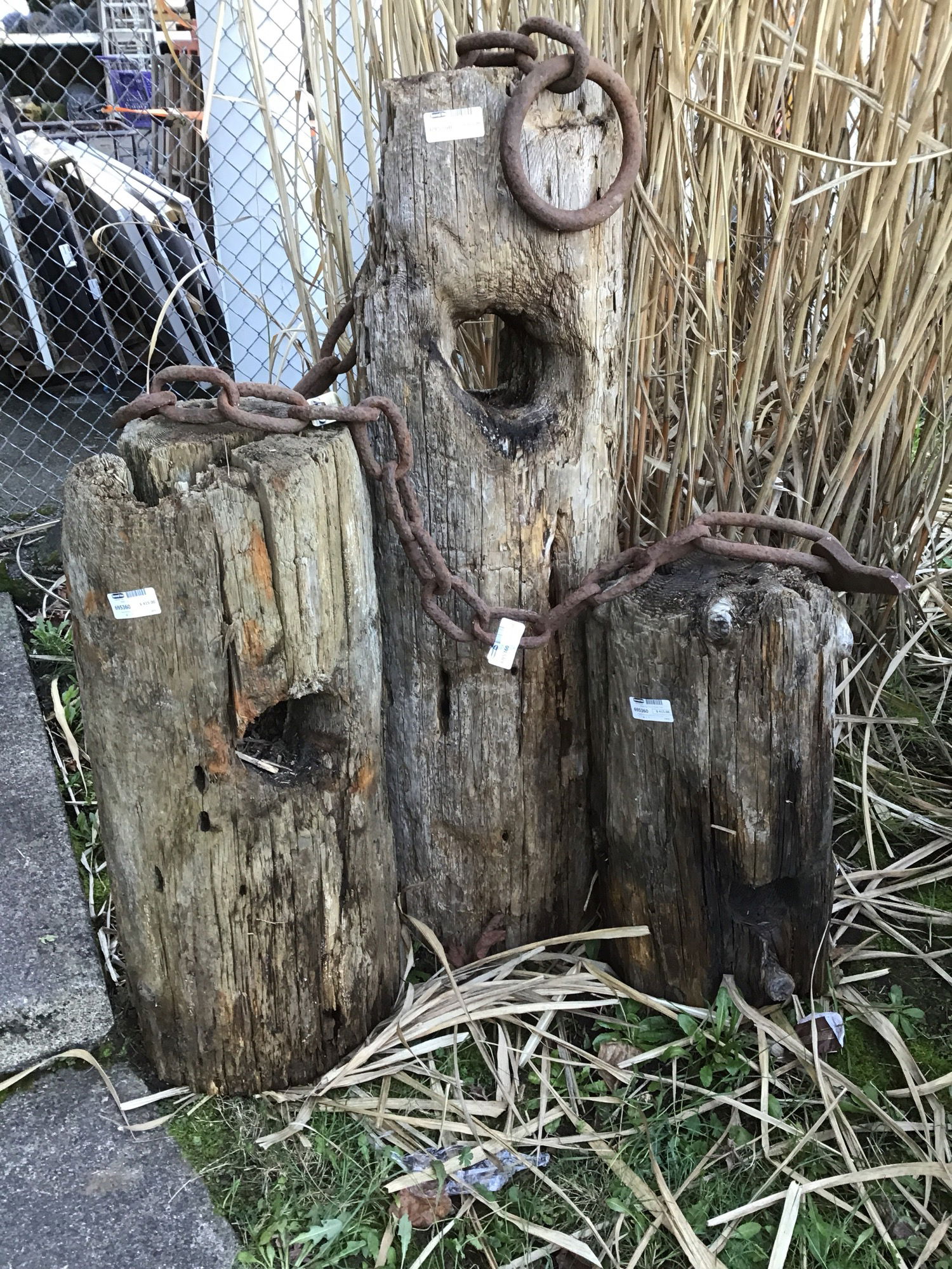 A classic Northwest coastal look: three rounds of rustic fir with teredo clam bores & a hefty nautical wroughtical chains. Average width around 13" and heights range from 29" to 54". This raw stock fir comes from the same type of wood, Teredo Fir, we have been merchandising as paneling, bookmatched sets and live edge lumber. Sold with rustic boom chain that ties the three pieces together. Incorporate a bit of local history into your yard!