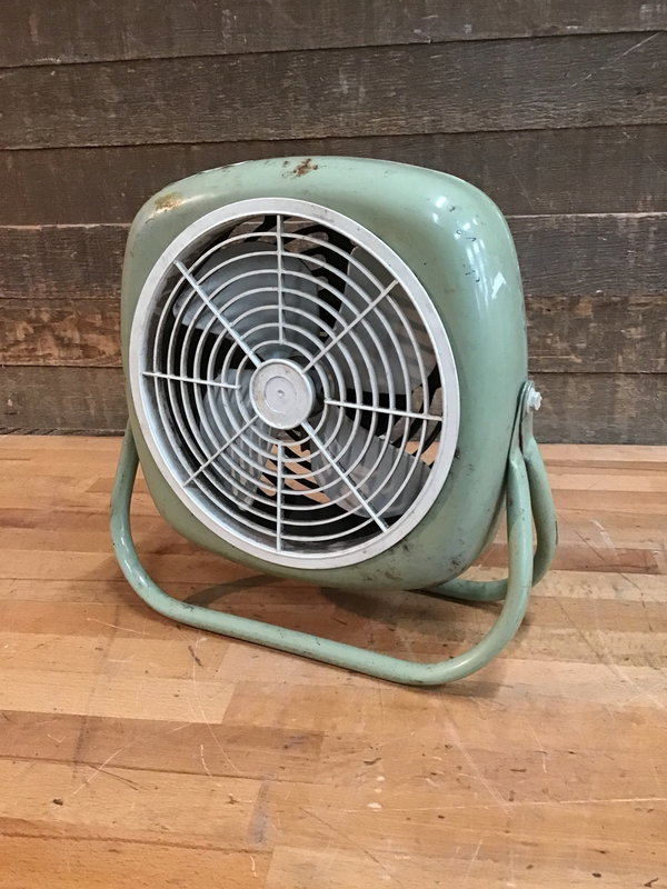 Cute little mcm box fan with a desk fan size. Needs a repainting but turns on.