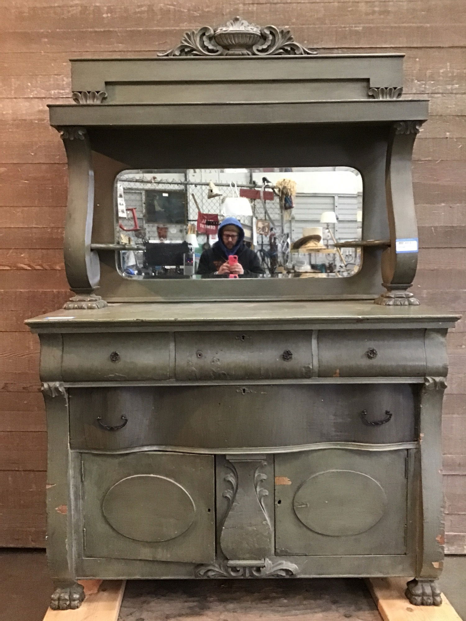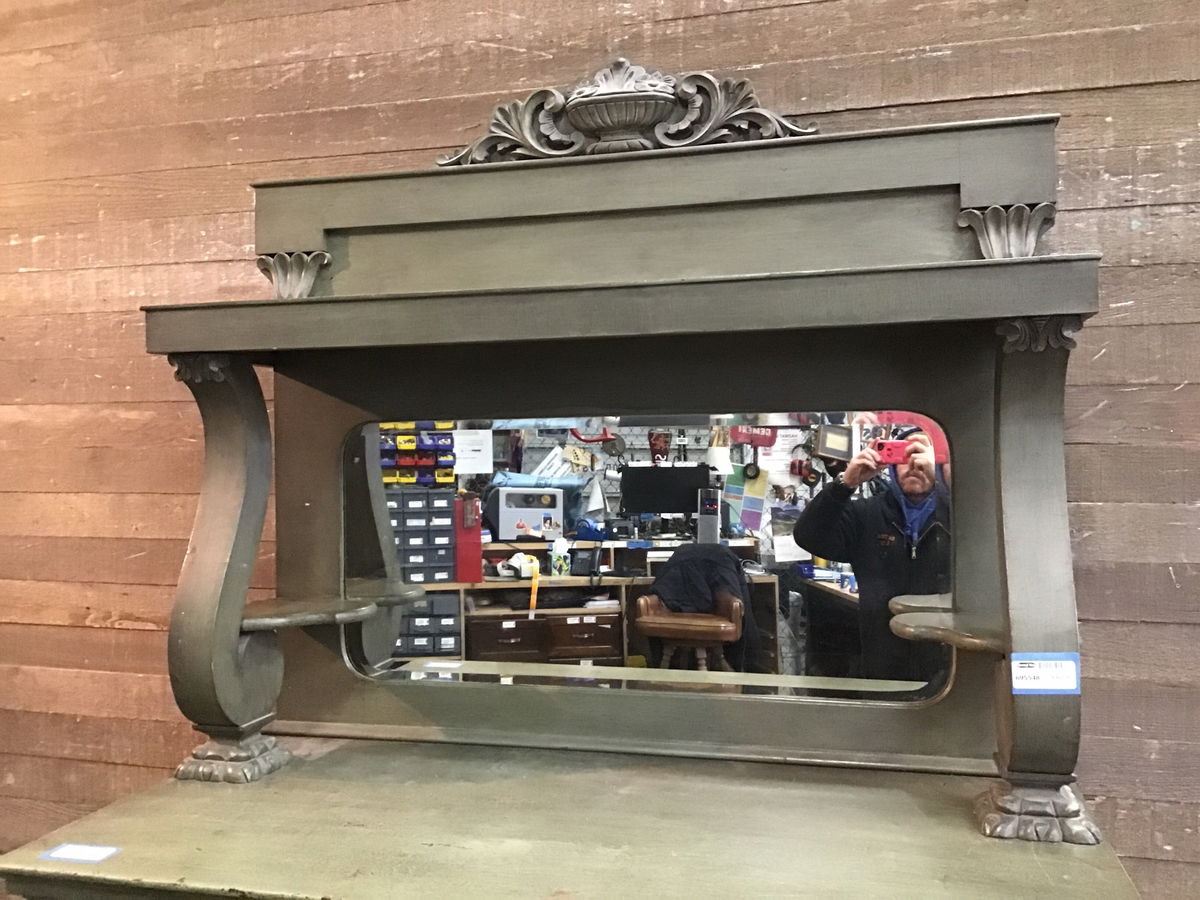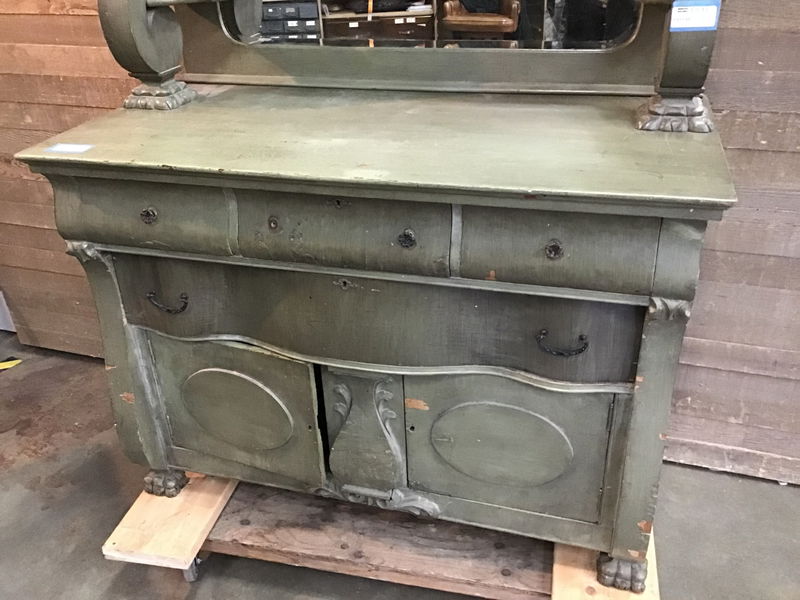 Late 19th Century Empire style Buffet with mirror. A bit of a behemoth here, and painted a rustic sage green. Unfortunately missing most of its original hardware, but that's where you come in. Would be a great addition to a retail space looking for a unique piece.