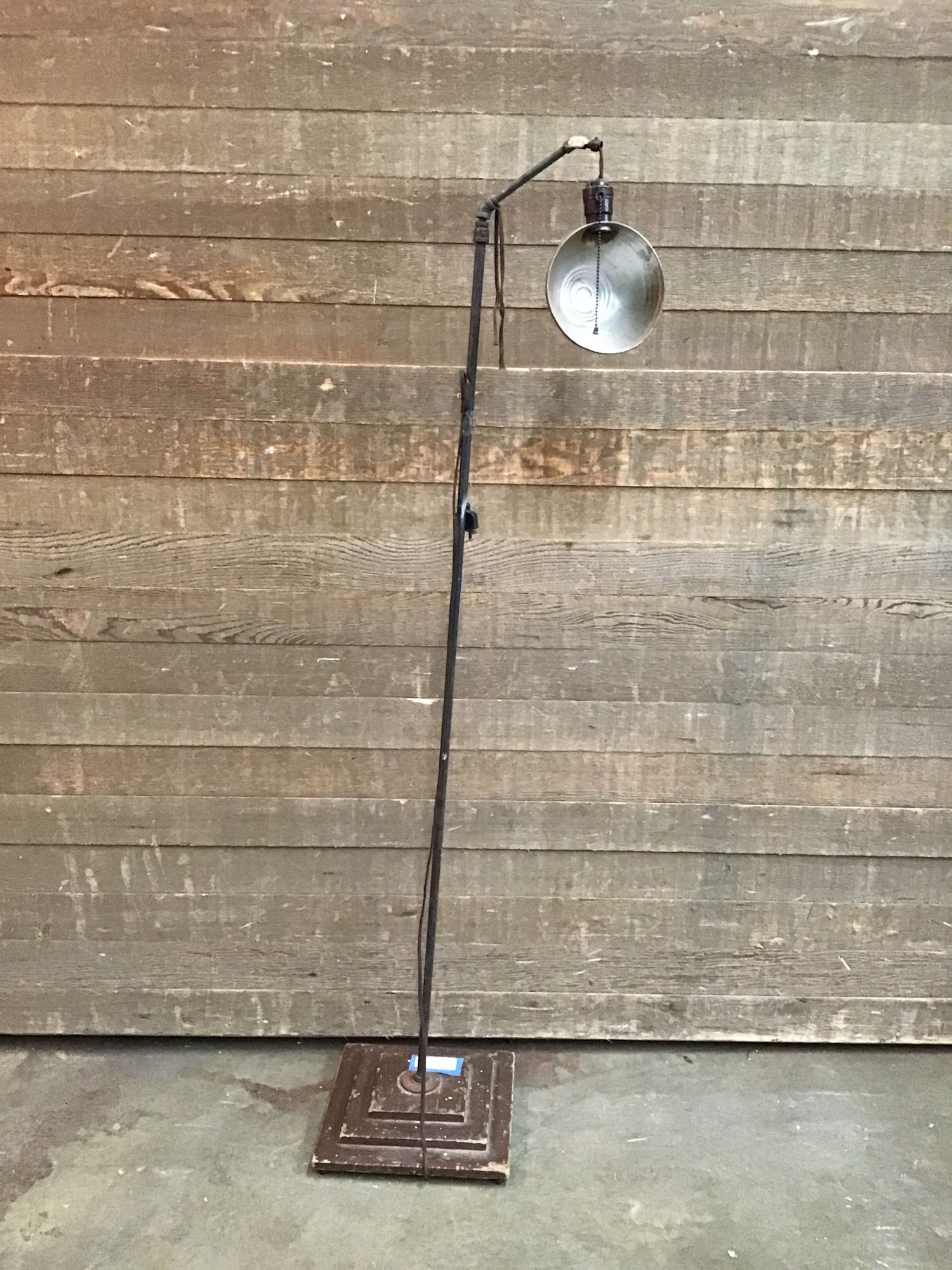 Interesting antique floor lamp. Looks to be a 1920's industrial styled top with maybe a home made art deco wood base. Still cool, still a project piece. Would need to be re wired and some work needs to be done on the upper assembly.