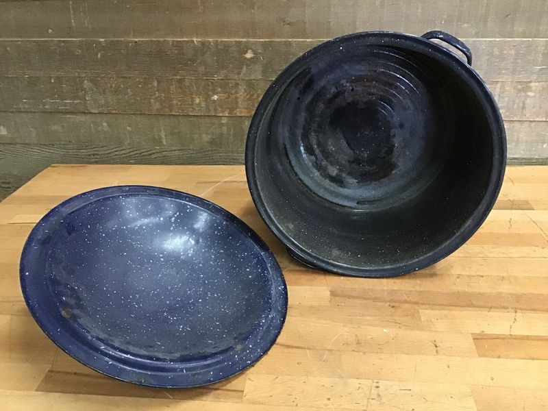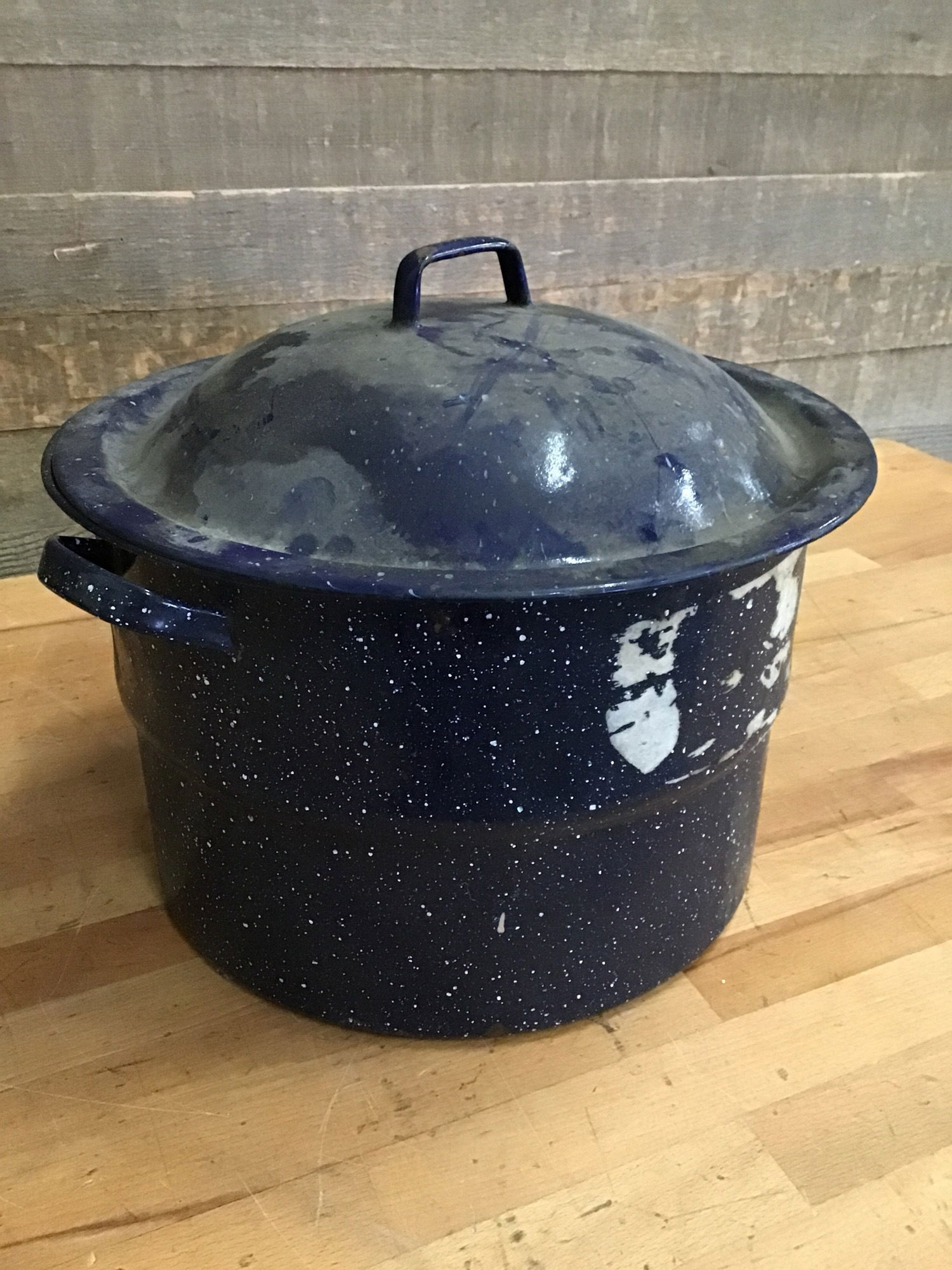 Blue speckled enamel pot with lid in fair condition. Great for collectors! Use as decor or storage! Needs a good clean, and there is a little rust on the handle of the lid and the bottom of the pot.
