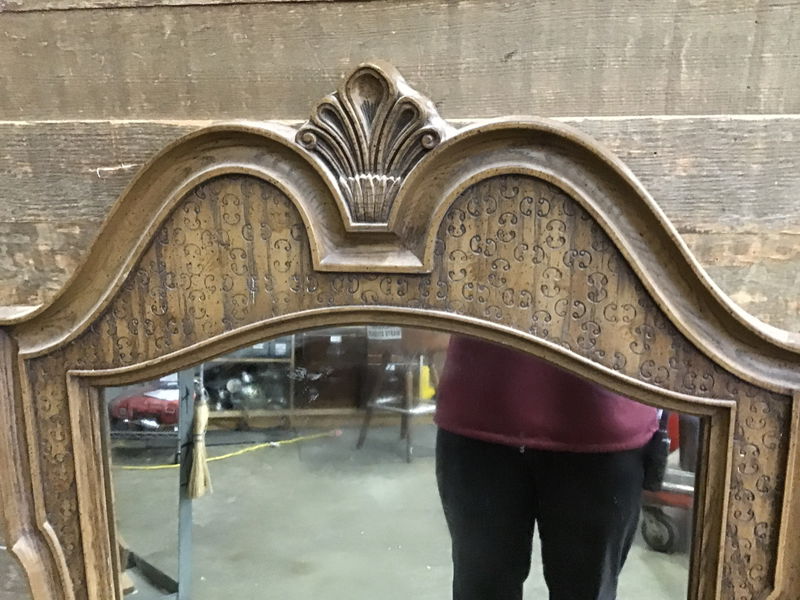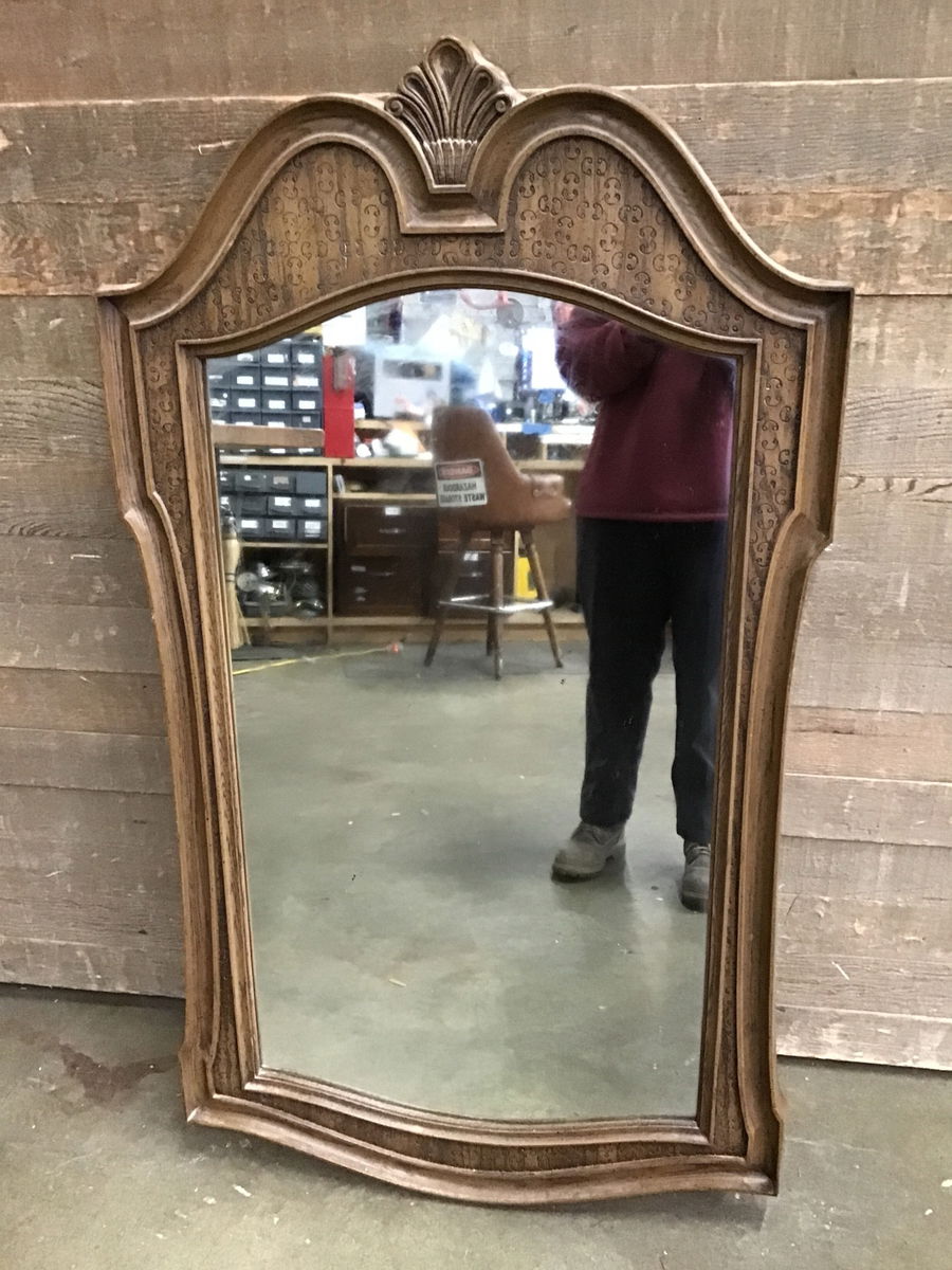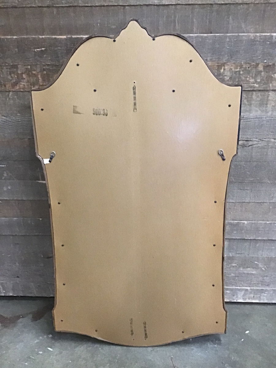 Cool vintage mirror with a faux wood frame mirror. Has two little d ring hooks on the back for hanging on your wall. The frame has some fun swirly designs on it.