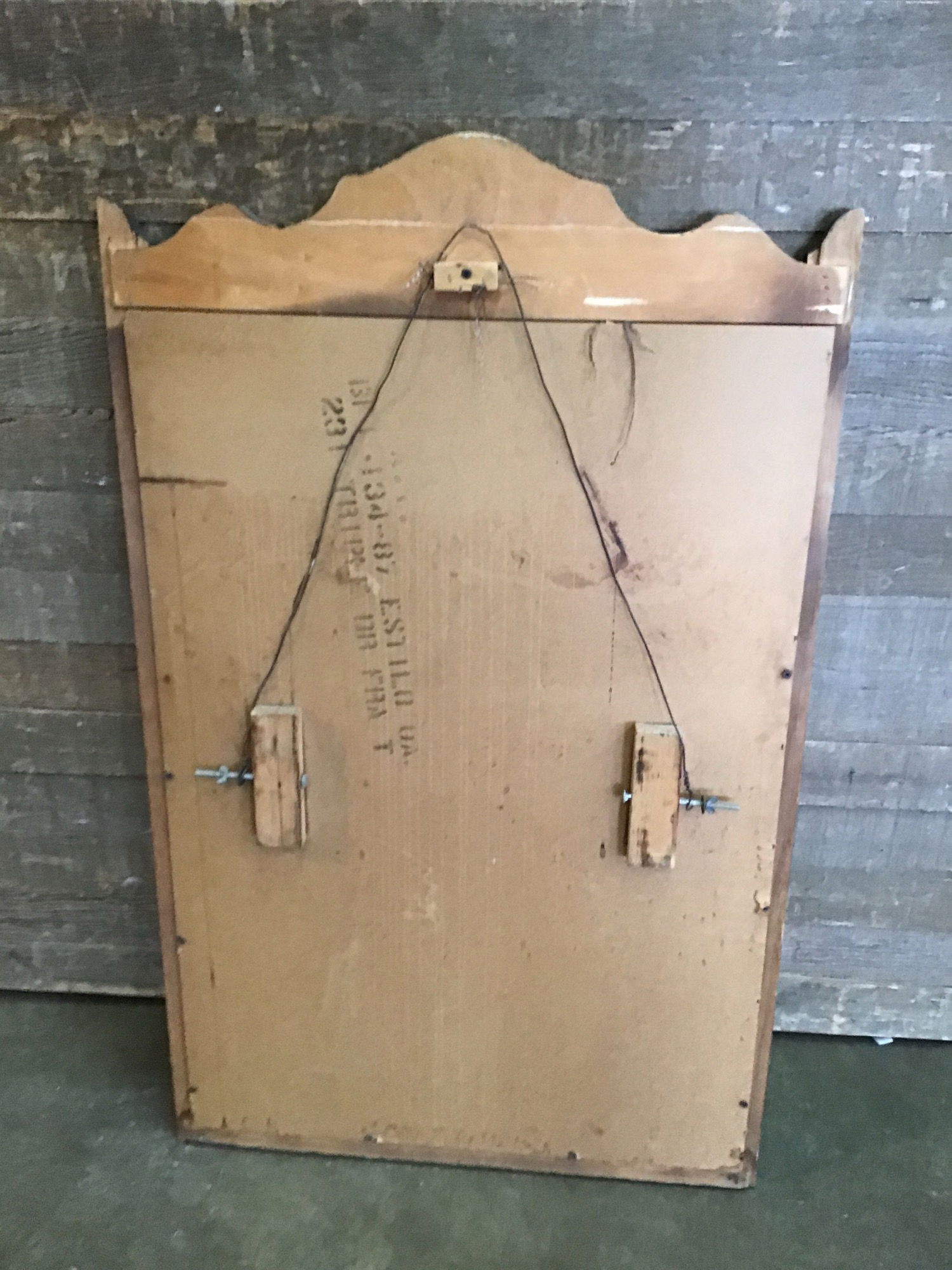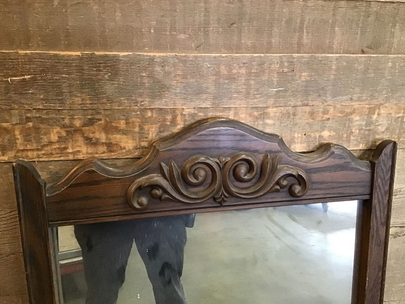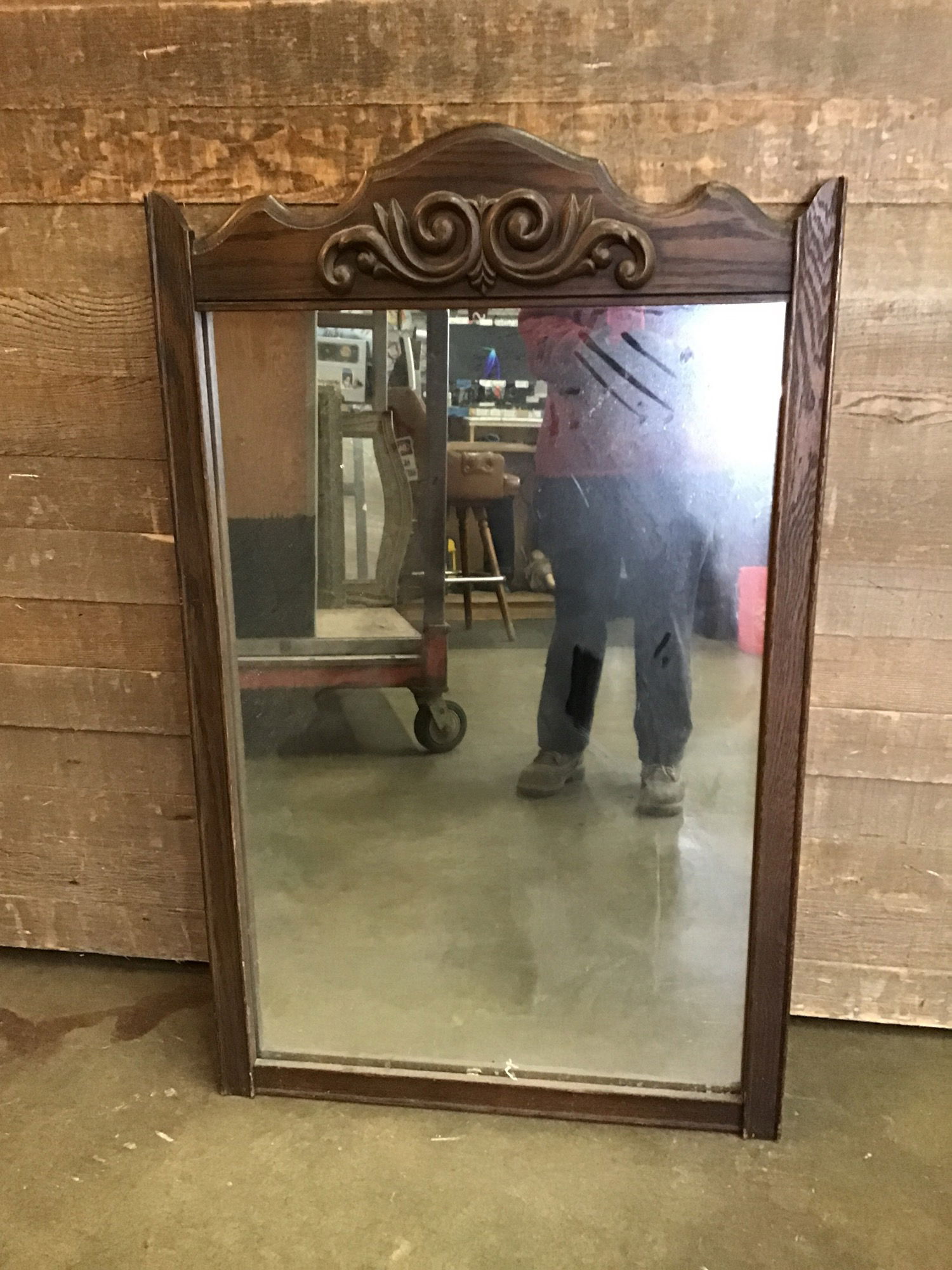 Vintage mirror with a dark stained Oak frame in pretty good condition. Has a wire on the back for easy hanging.