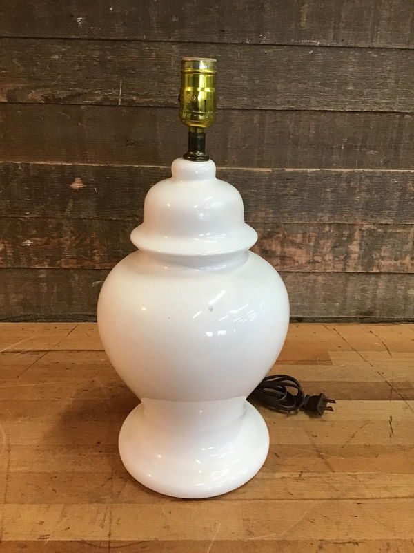 White colored ceramic lamp in good condition. Does not include a shade. Tested in house and worked fine.