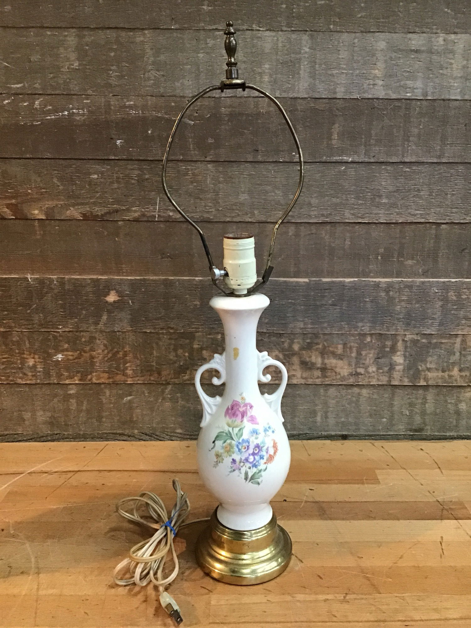 Vintage white ceramic table lamp with a printed floral motif and a brass base. Does not include a shade. Tested in house and worked fine.