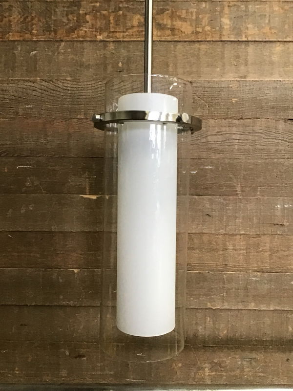Modern brushed nickel pendant light in great shape. Has a frosted white glass shade surrounded by a clear glass shade. Manufactured in 2020. Wiring looks great though we always recommend a full test prior to installation. One of the rods can be removed to adjust height by about 12" if desired. Photo may be representational.