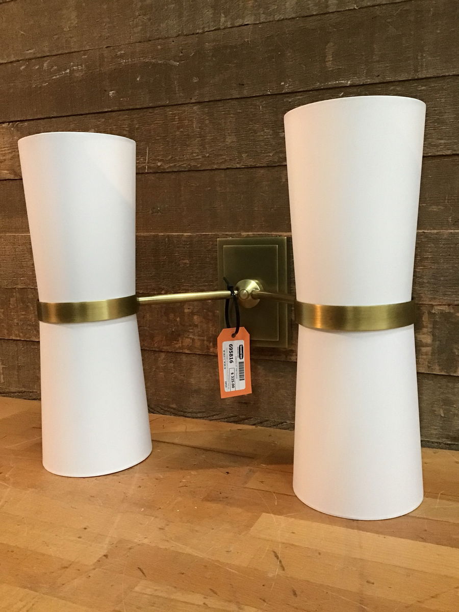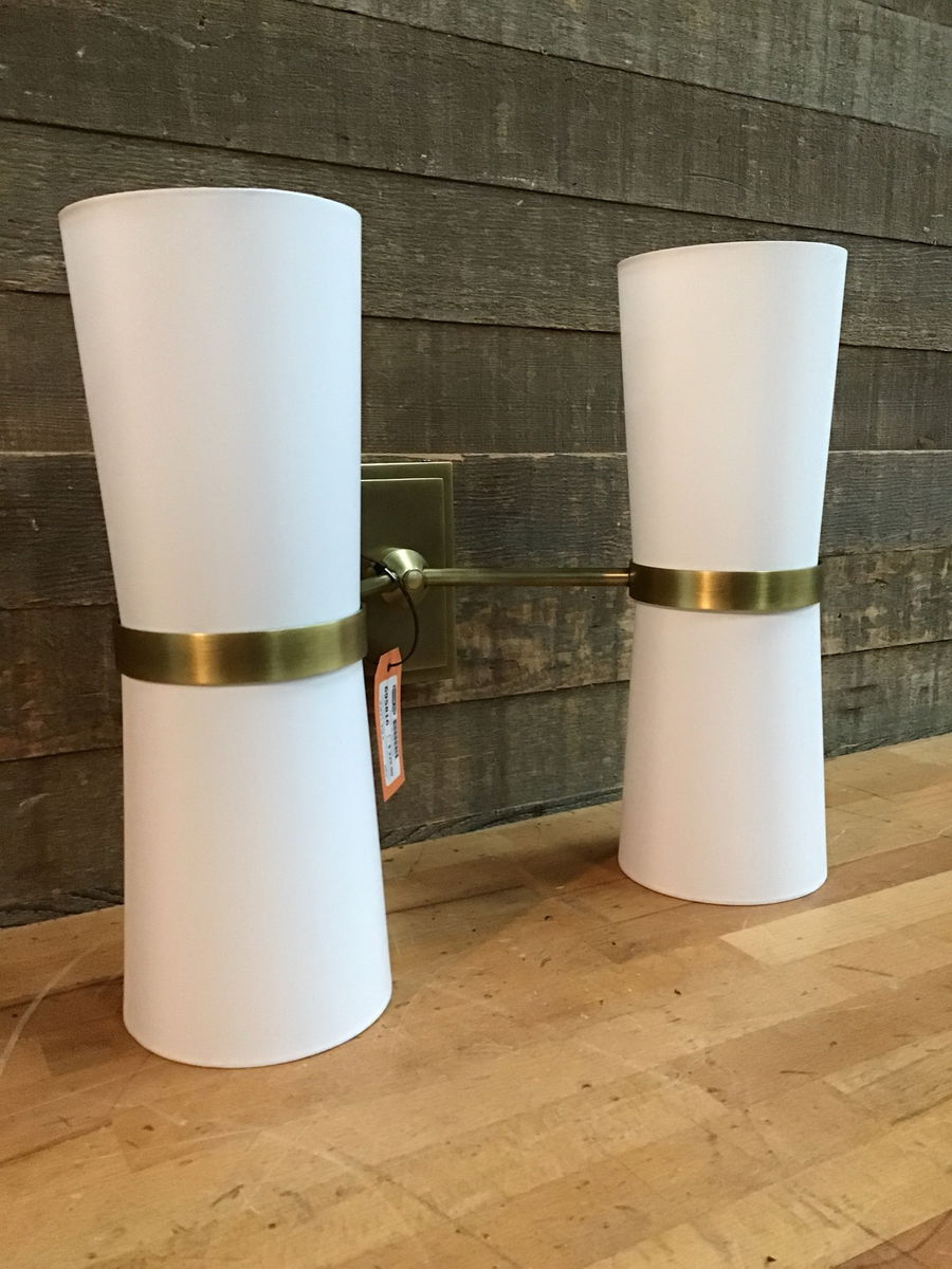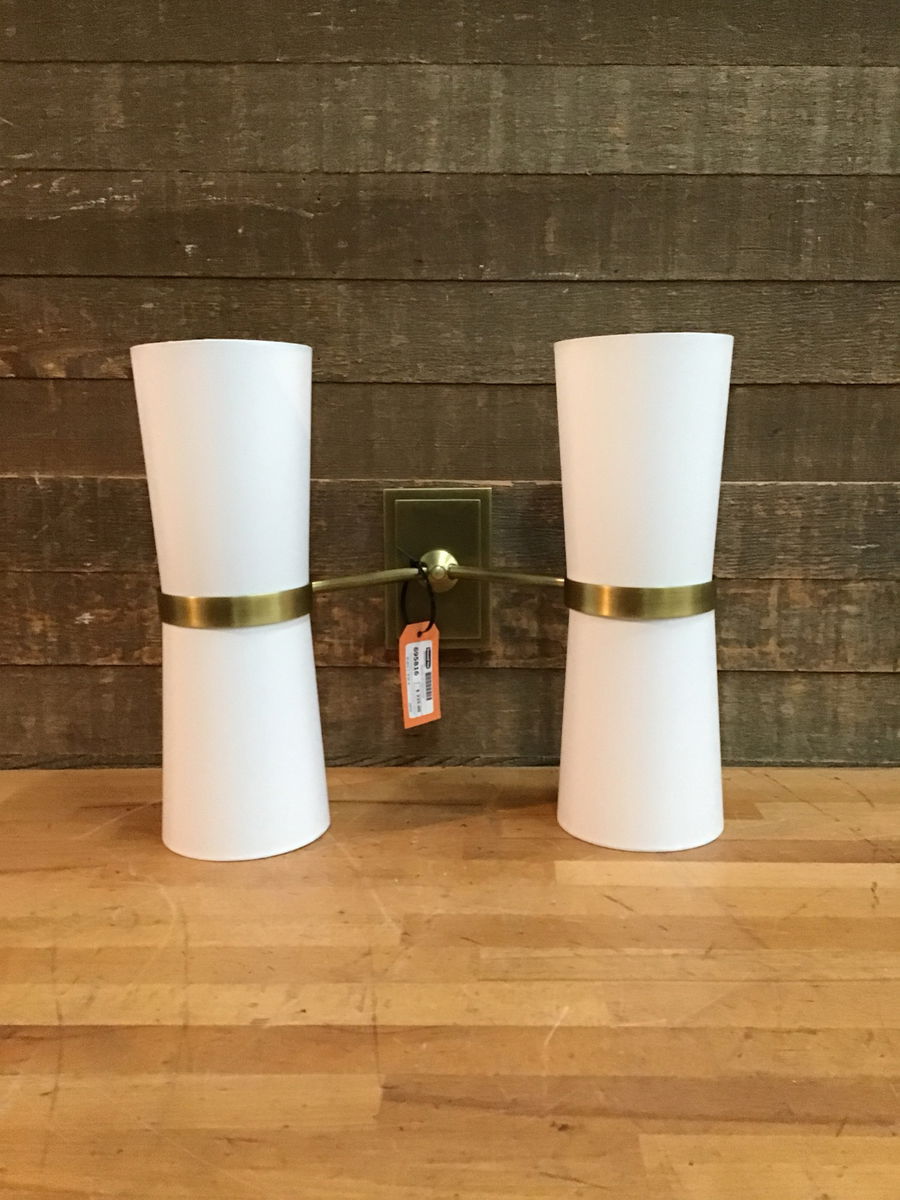 Arteriors "Inwood" 15" premium luxury wall sconce. Fresh assembled from the box by us with a gorgeous antiqued brass finish and striking white shades! More info on this item here, retails for well over $900 new, crazy!