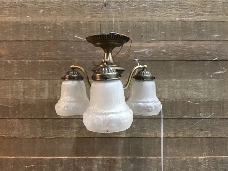 Semi-flush mount light with an oil rubbed brass finish and some repro Victorian shades.