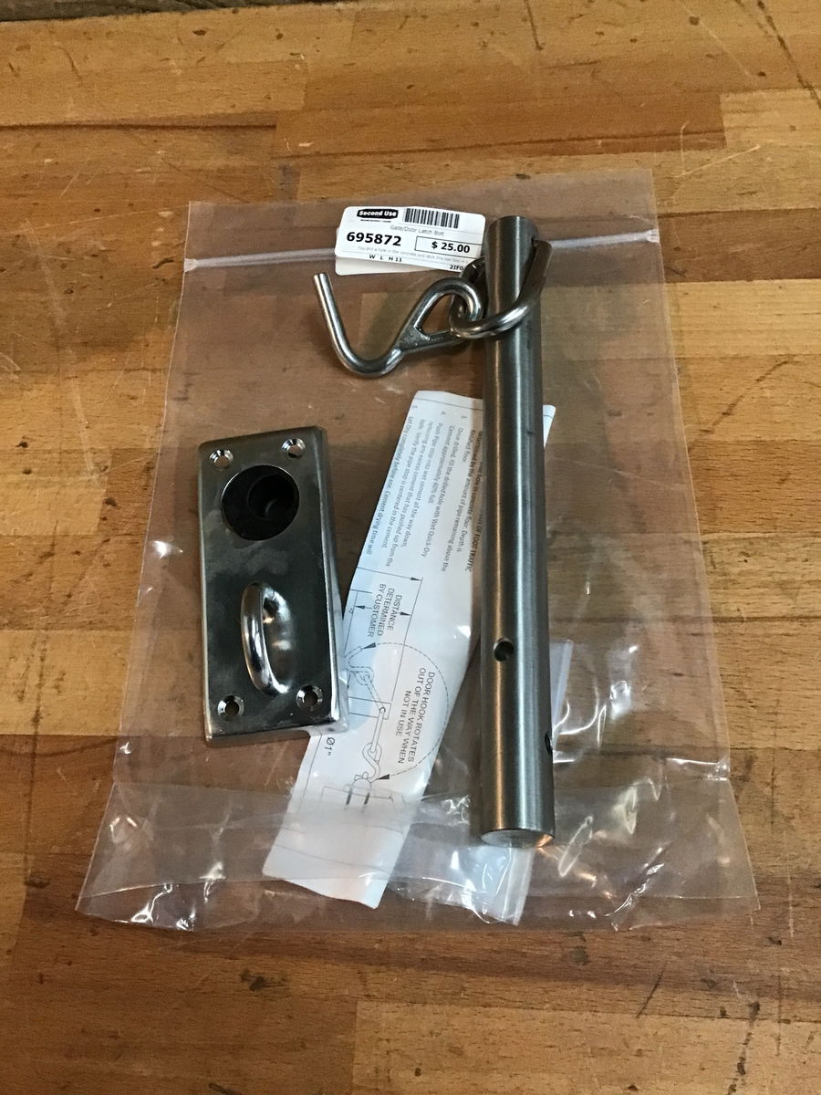 You drill a hole in the concrete and stick this bad boy in so you have an anchor point to latch a gate or heavy door. Nice and solid probably stainless steel or zinc.