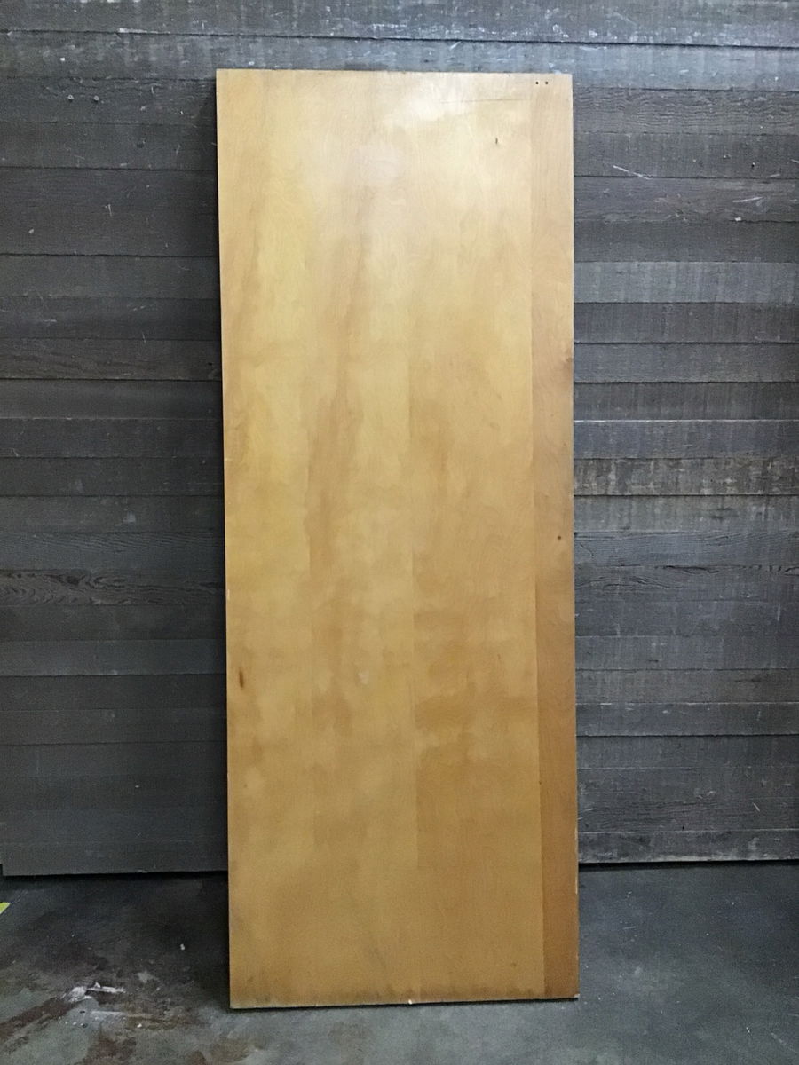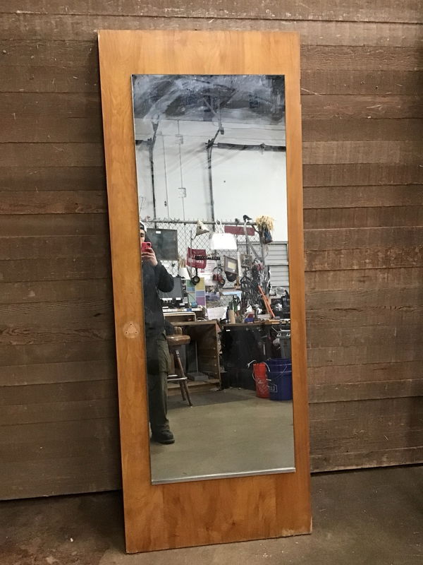 Hollow core interior door with a hardwood veneer and clear finish. Has a big ol' mirror attached to one side, maybe with a strong glue?