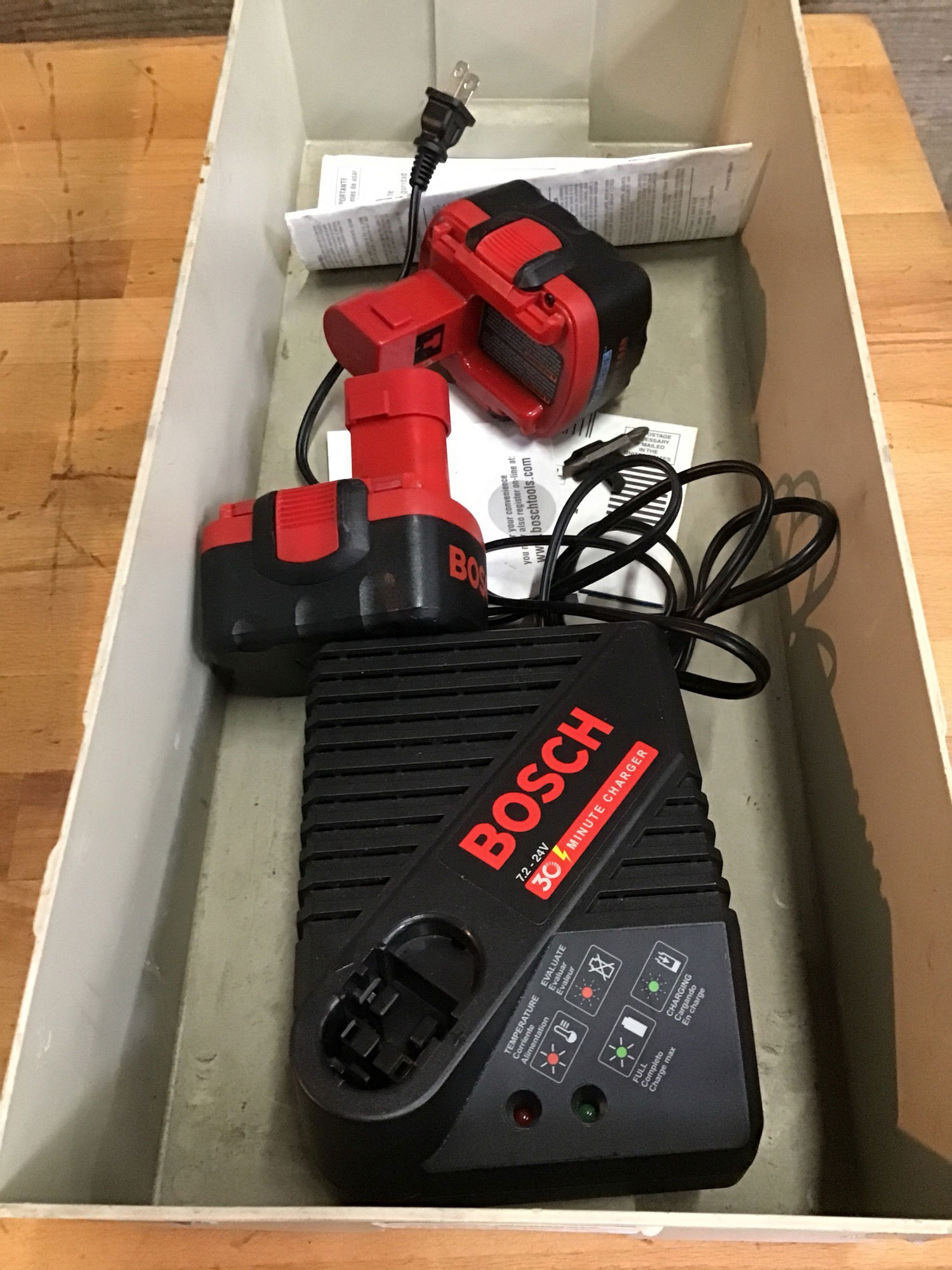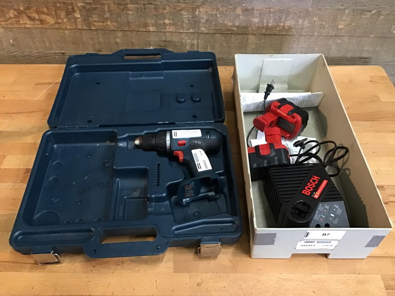 Bosch power drill. Model 32614. Comes with case, charger and two batteries. Drill worked with one of the batteries without any time charging, but unsure of the life of the batteries. Charger lights up when plugged in. Follow this link for replacement batteries