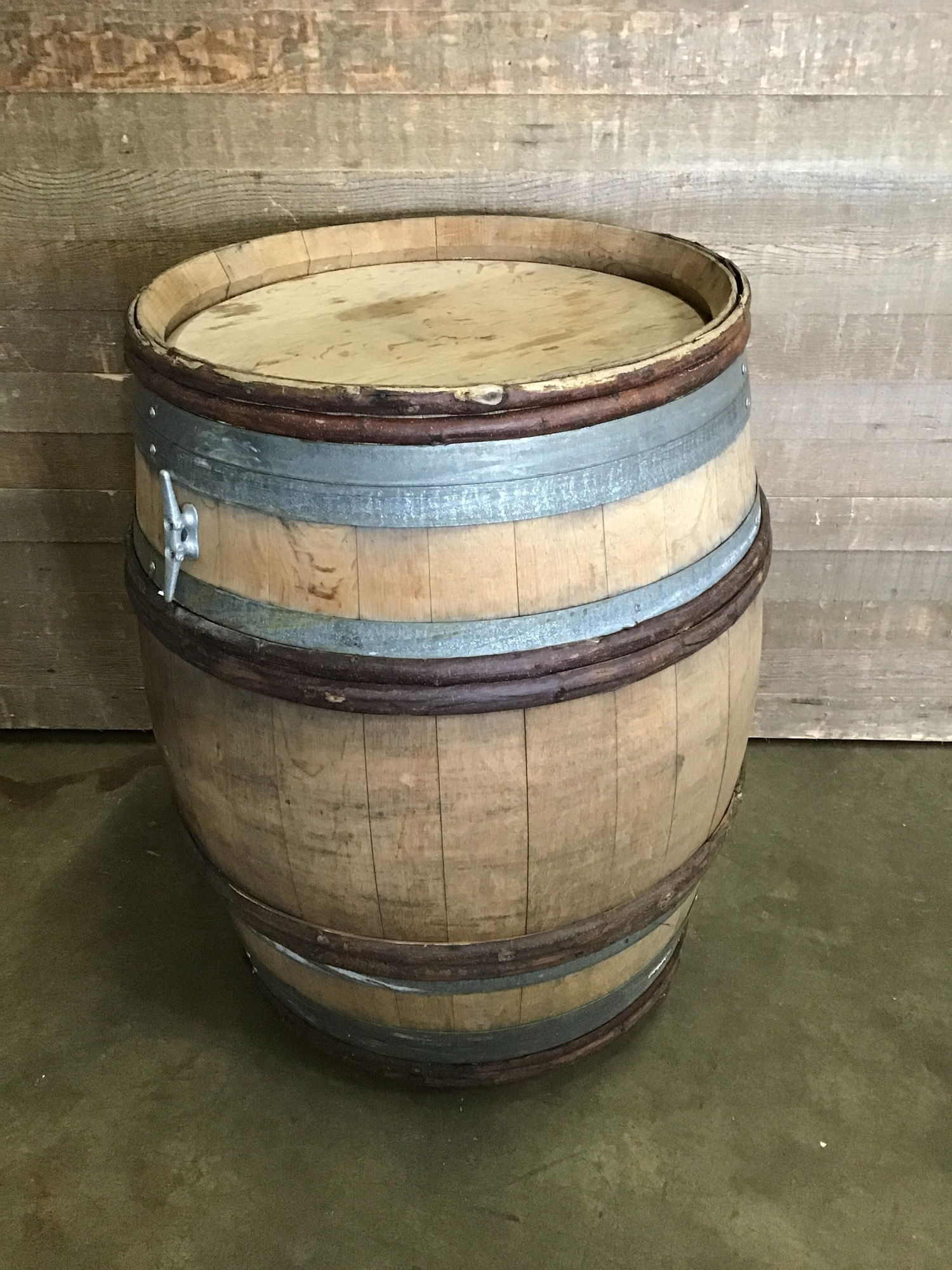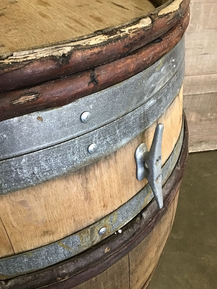 Pretty dang sweet Wine Barrel table from a local brewery. This barrel is in solid condition and has been mounted on four caster wheels for easy moving. Has extra bent twig decor around the barrel and a rope cleat mounted to the side to hang your bags on. The top has a lip along the diameter as well. Measurements are approximate. Overall a really cool piece that's perfect for your home bar or business.