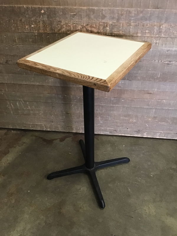 Nice tall cafe table with a steel base picked up from a local brewery. Top is a gridded laminate with an Oak border. In good used condition. Not a fan of the top? This would be super easy to take off and replace with a table top of your choice. Great for restaurants/cafes or small kitchens! Photo may be representational.
