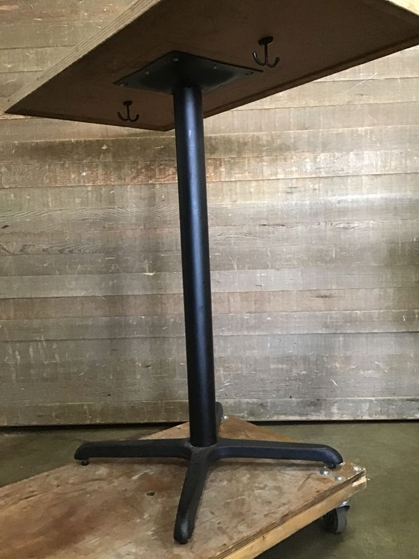Nice tall cafe table with a steel base picked up from a local brewery. Top is a gridded laminate with an Oak border. In good used condition. Not a fan of the top? This would be super easy to take off and replace with a table top of your choice. Photo may be representational.