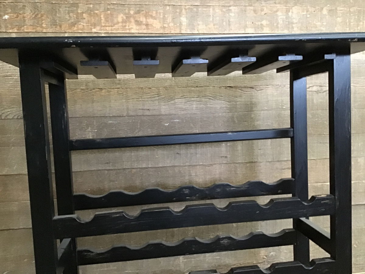 Nice wine rack table that's painted black. Can fit 24 bottles of wine and have 6 slots under the top for wine glasses. It could use a fresh paint job, or to be stripped down to the wood base.