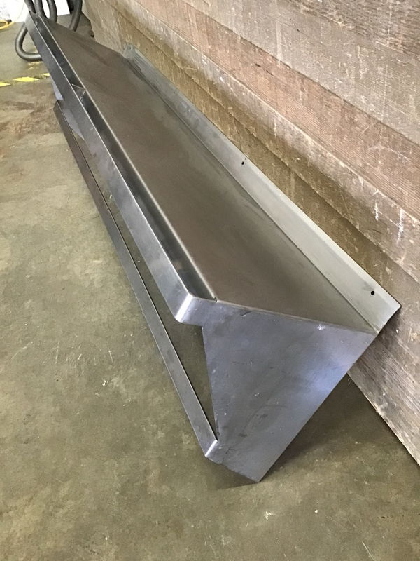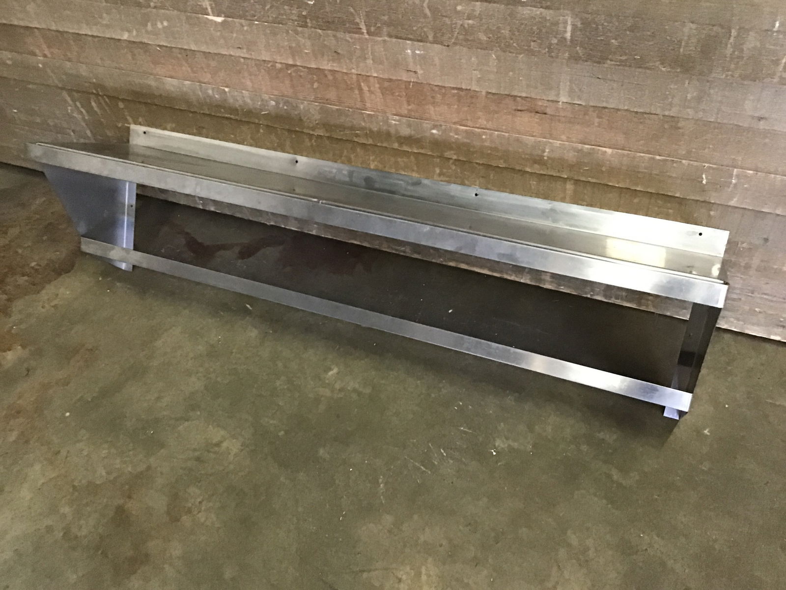 Heavy duty, wall mount, stainless steel pot rack shelf, picked up from a local brewery. This shelf has a bar across the bottom to hang your pots from and another pop out bar for utensils. Perfect for an industrial kitchen or to elevate your home kitchen.
