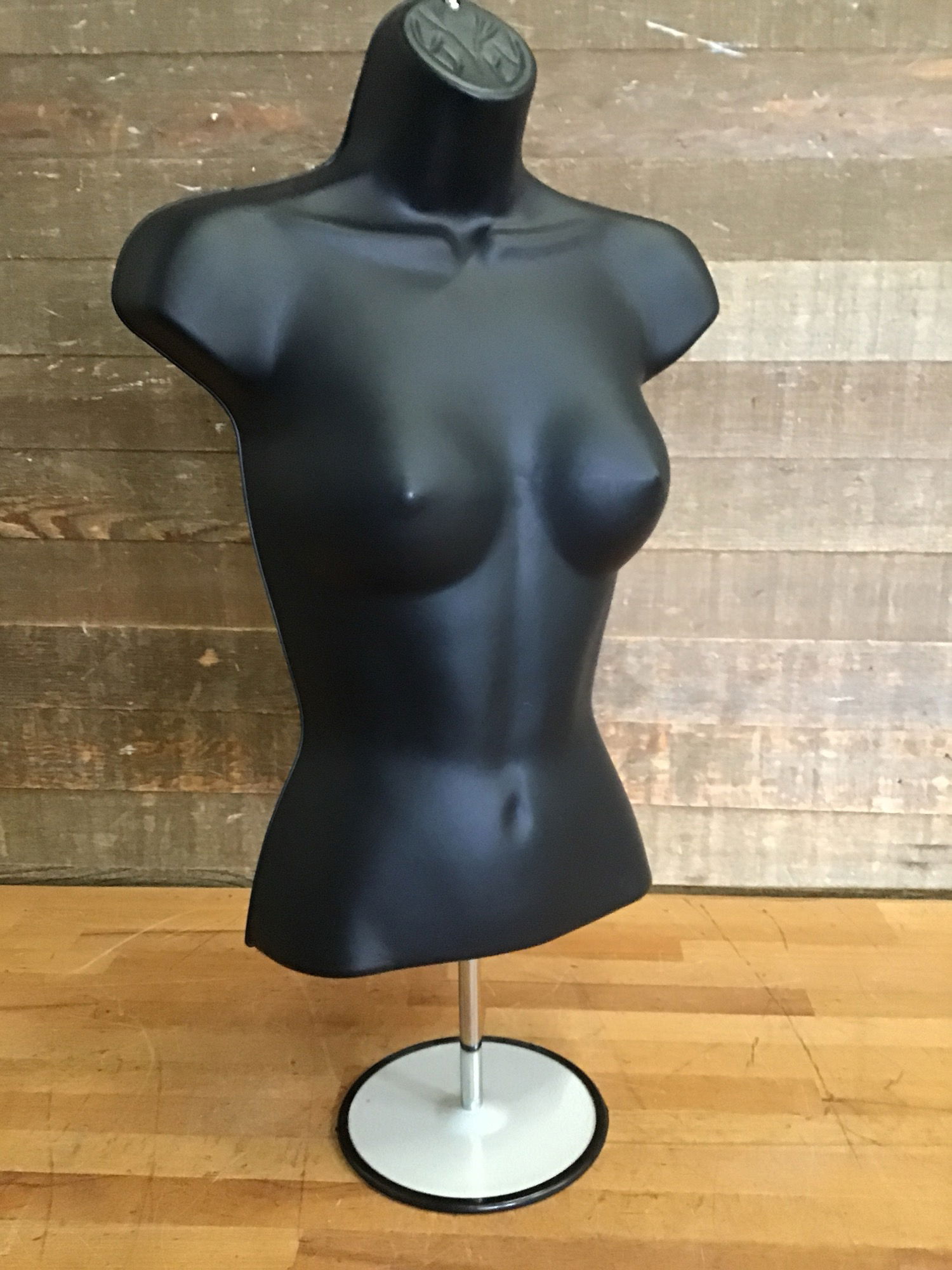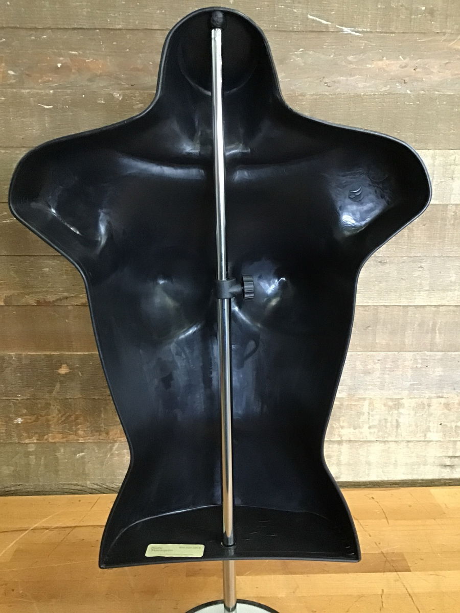 Tabletop mannequin with adjustable height on a round steel stand. The body is black plastic. Good used condition with little to no wear. Measurements are approximate.
