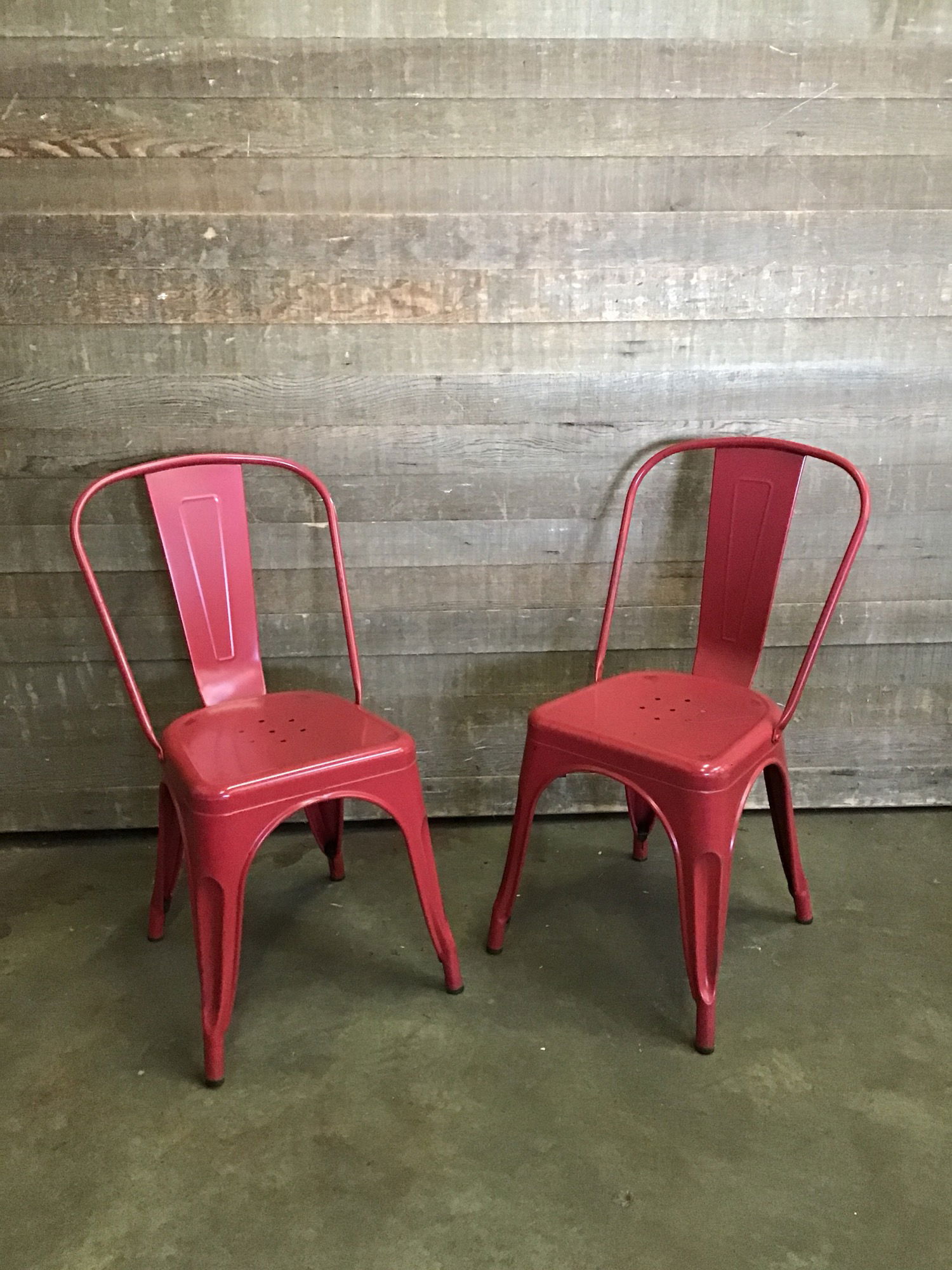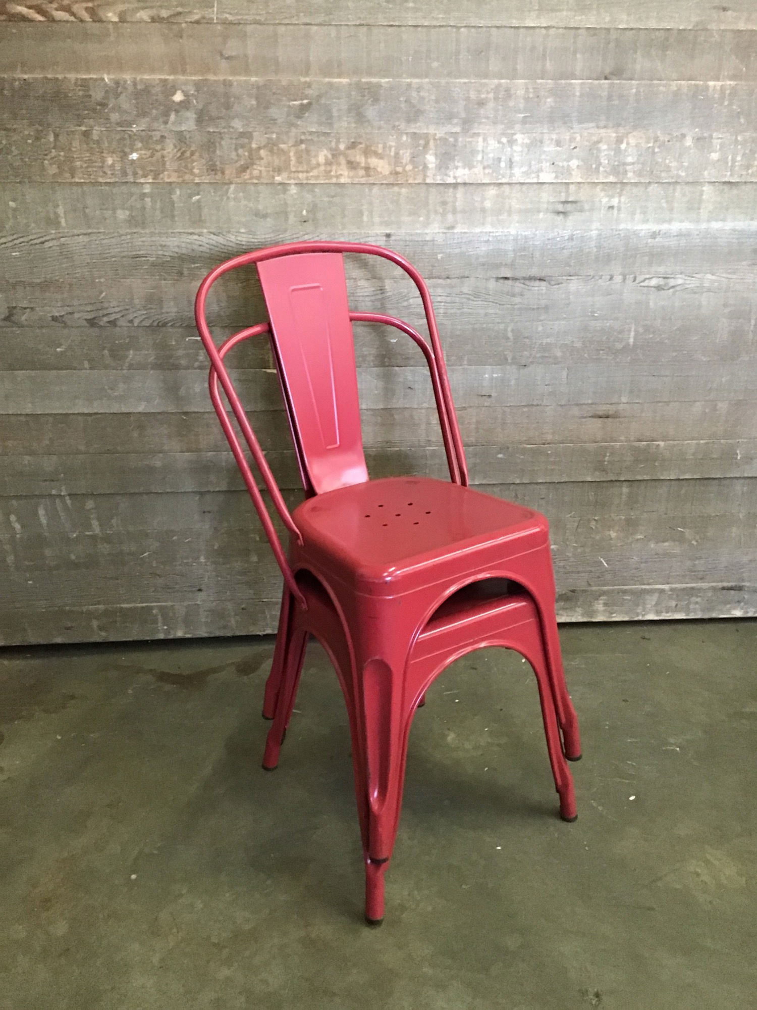 Spring is just around the corner. Some birdie told these red chairs would look nice on your patio. Made of metal, painted a nice red color. Features holes in the seat so water doesn't pool. These are sturdy and stackable when you need to put them away for winter.