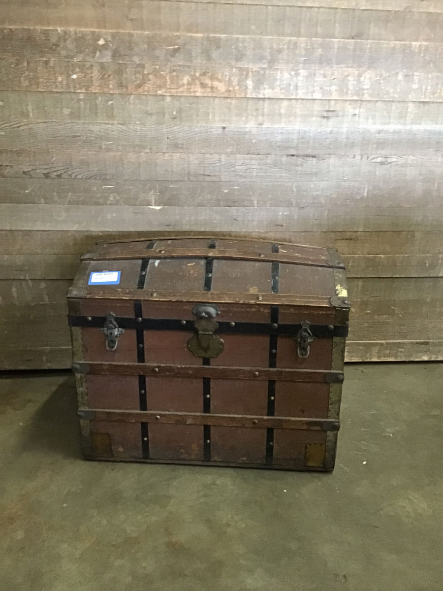 Antique steamer trunk/chest with a domed top, made of wood and framed by brass and steel lining. The inside has a removable shelf as well with cloth banding for the base. The chest also has some old weathered shipping stickers on one of it's sides, so this bad boy has clearly seen some travel. It's old and a little worn but that's a part of the charm, isn't it? Price reflects condition and antique nature.