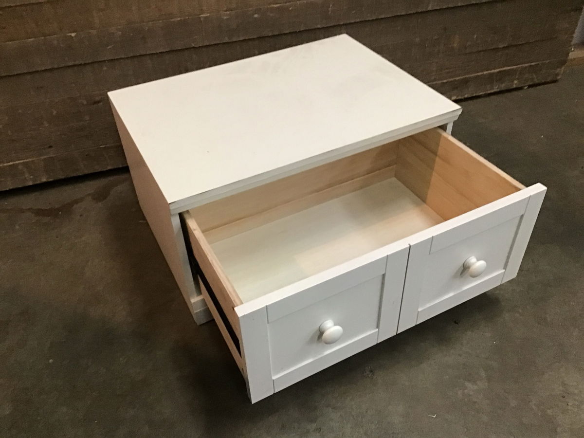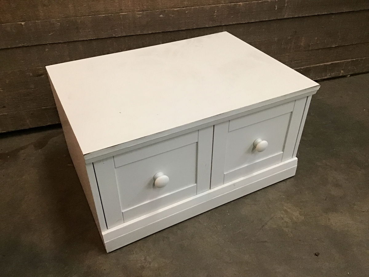 Short little storage drawer with a particle board box. The drawer is faux divided on the face. We have two other similar drawers in stock and they can be stacked if desired. Would be great for a business' back stock or in an entryway as a shoe bench. There may be some minor cosmetic damage, in particular the laminate trim is starting to separate.