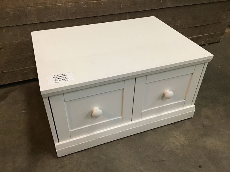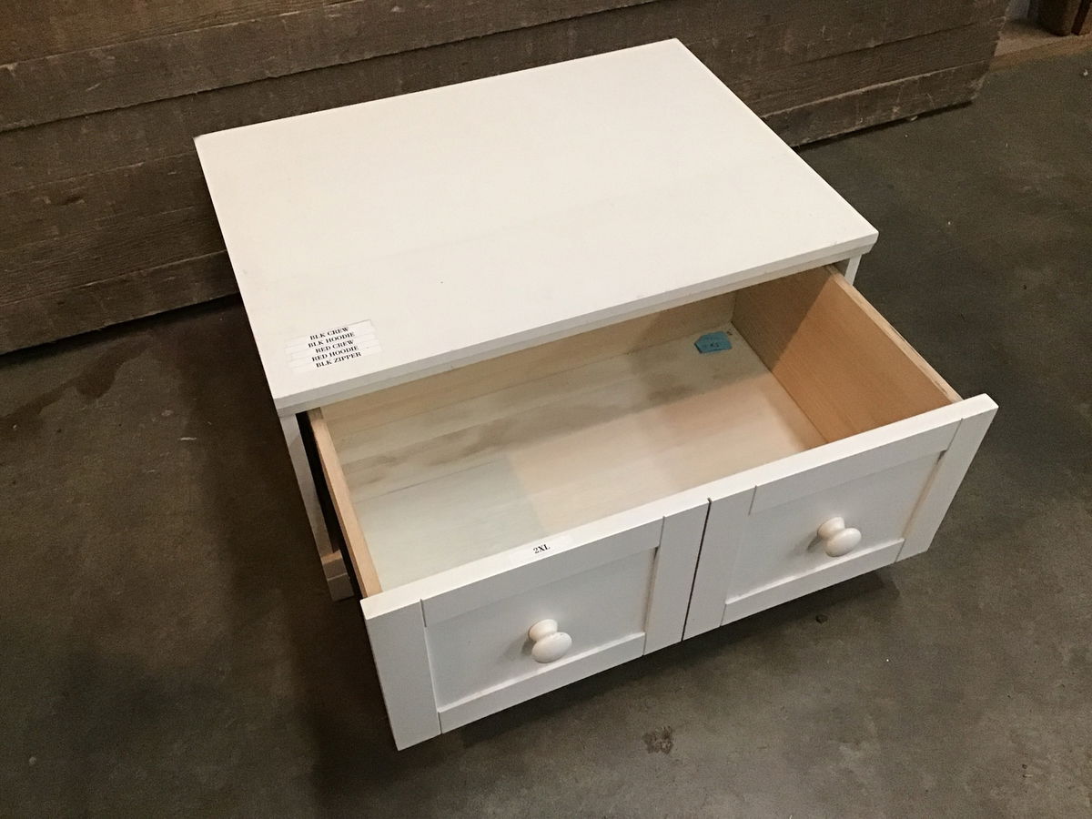 Short little storage drawer with a particle board box. The drawer is faux divided on the face. We have two other similar drawers in stock and they can be stacked if desired. Would be great for a business' back stock or in an entryway as a shoe bench. There may be some minor cosmetic damage.