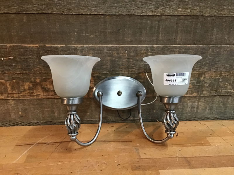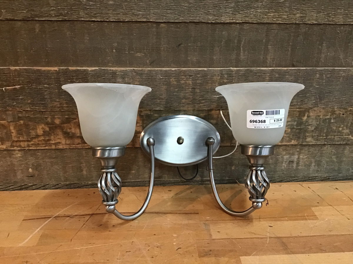 Brushed nickel finish body wall sconce with a twist and alabaster style shades.