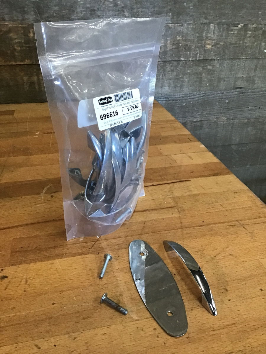 Bag of 16 midcentury modern chrome cabinet pulls with matching chrome backplates and screws for mounting the pulls. They are in relatively good condition, some of the backplates have a little bit of wear on their backs from previous use but they're still in good condition. Measurements are for each individual pull.