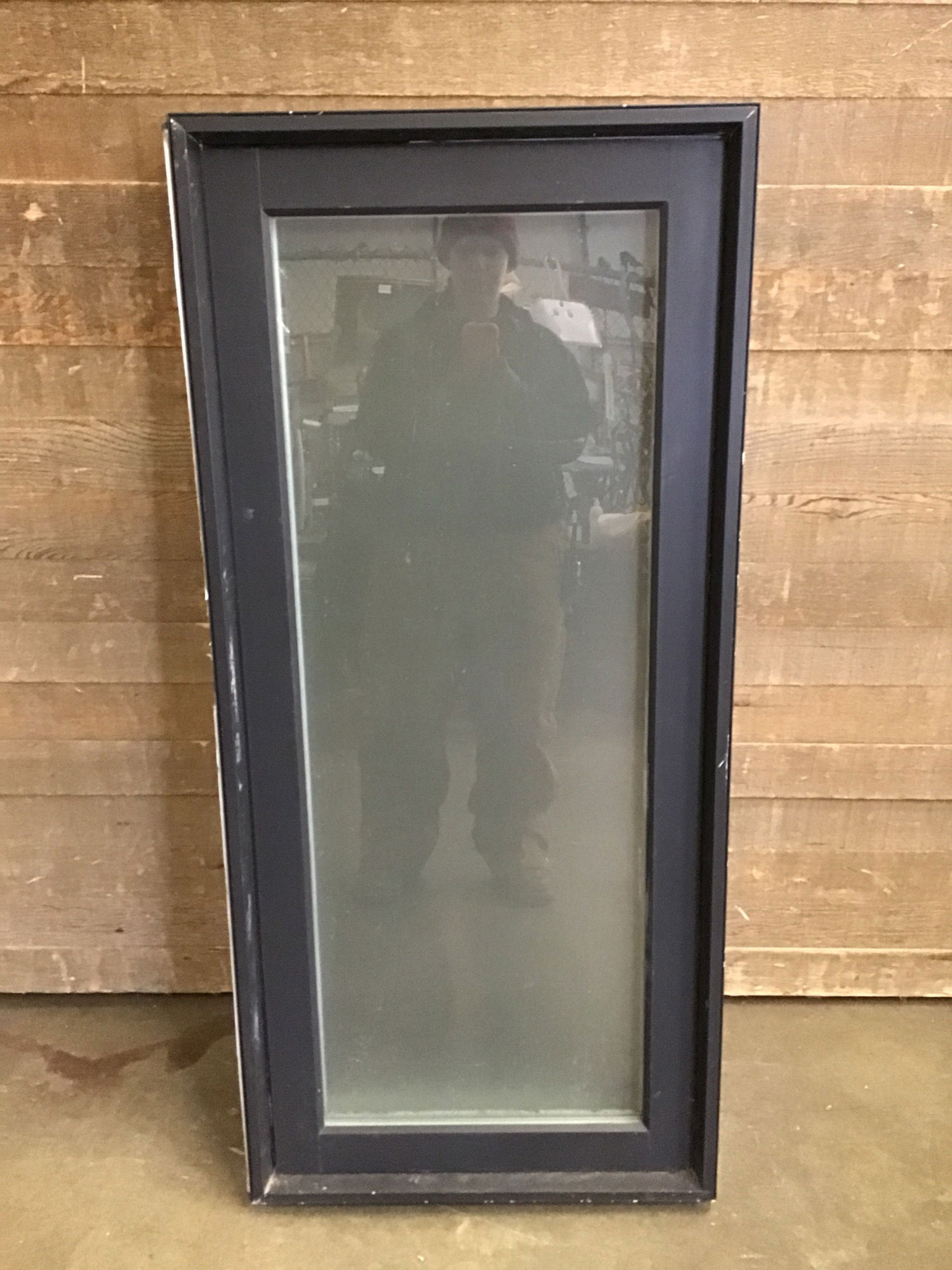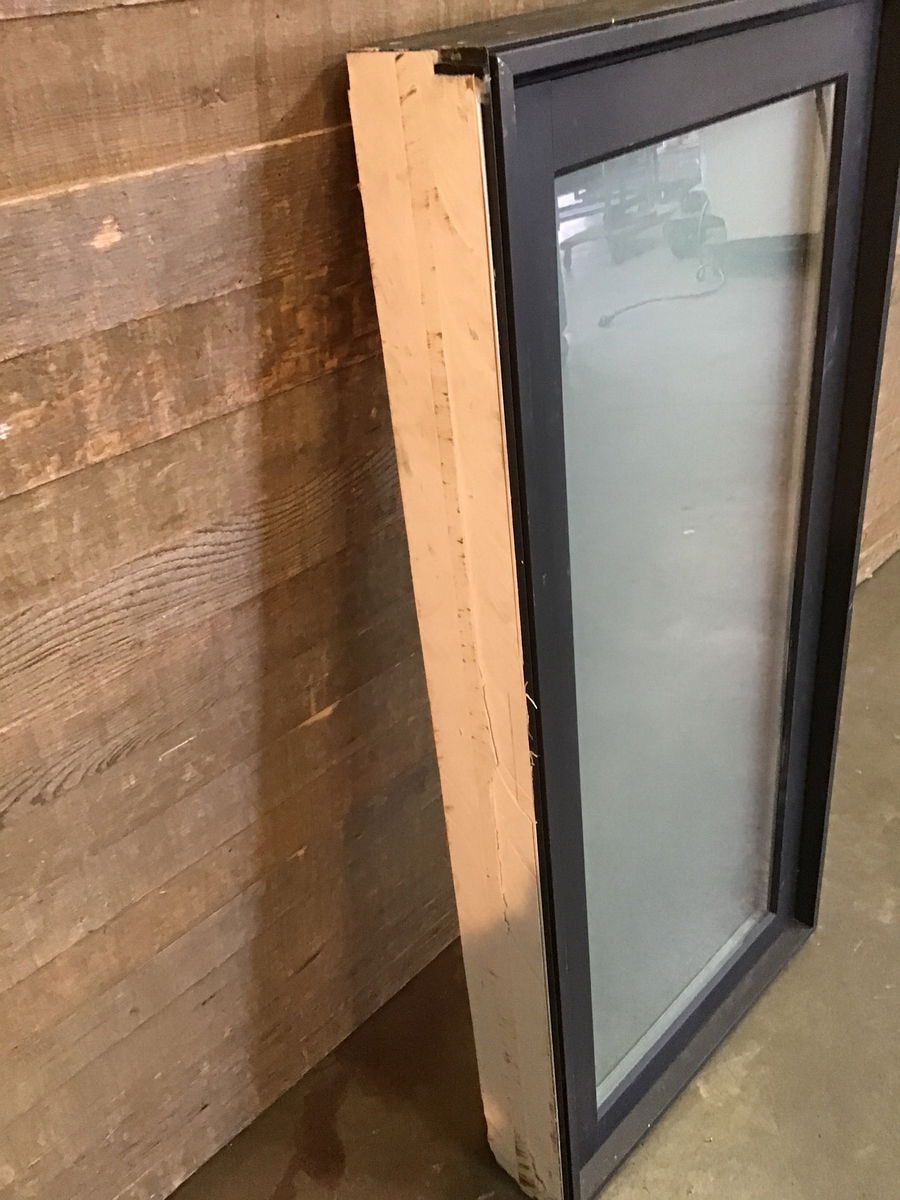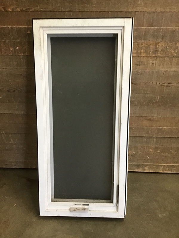 Fiberglass clad wood casement window in good condition with a frosted obscured pane. Comes with screen. Black exterior with white interior. Opens and closes smoothly. The crank handle included does not match, so a new one will need to be purchased if desired. One side has a sawn fiberglass cover indicating it may have been attached to another window, but the seal and frame itself is in good condition. Price reflects issues.