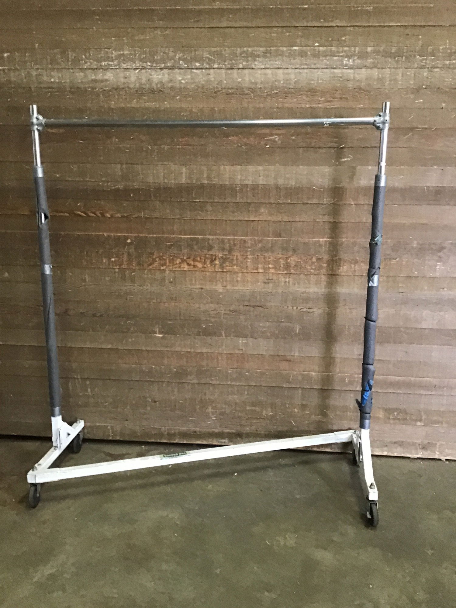 Rolling Z-Rack for hanging clothes or whatever needs suspended. We use these for hanging heavy chandeliers and they hold up pretty well. Can also disassemble into pieces for easier transport with a few nuts and bolts loosened.