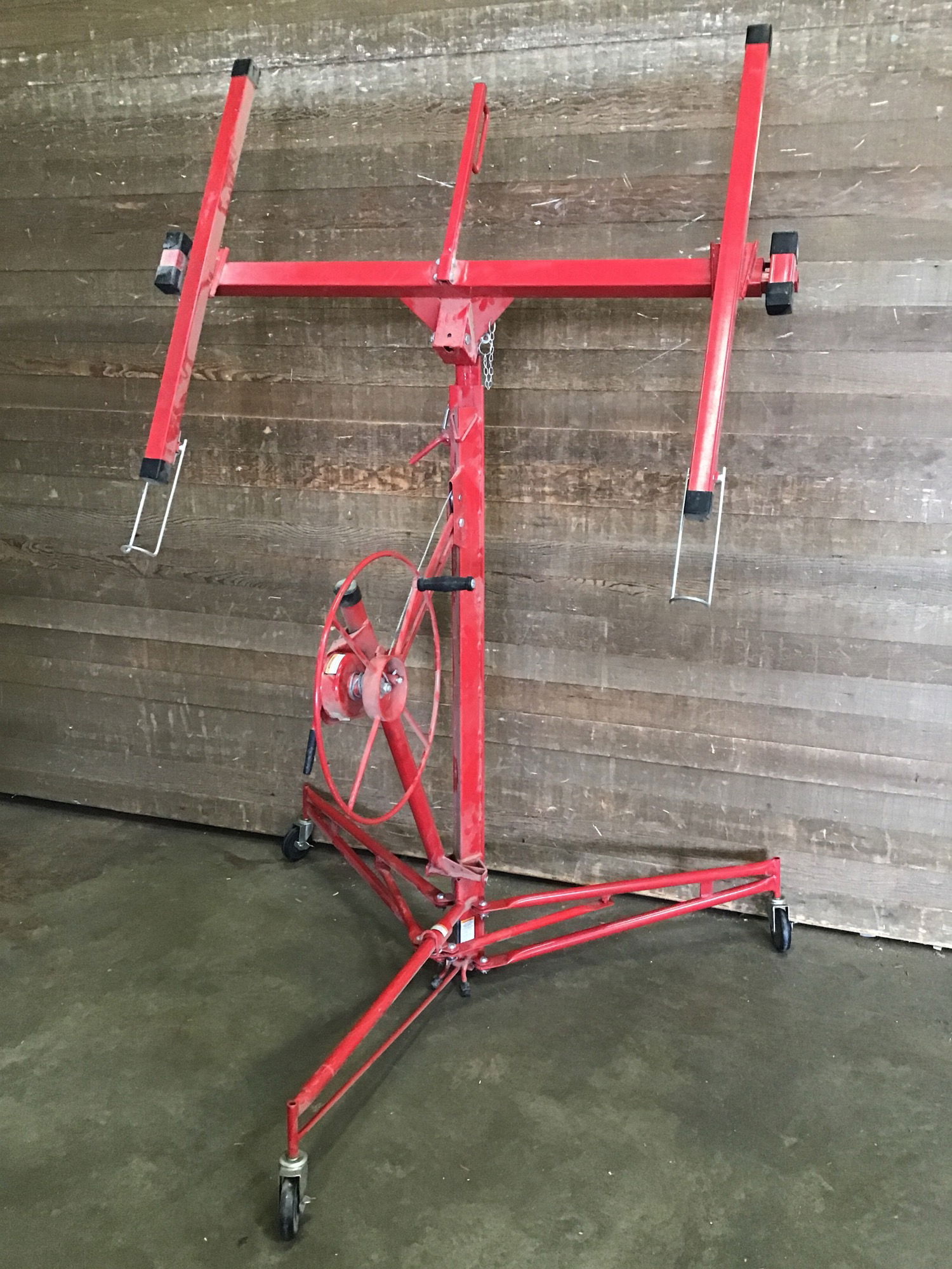 HaulMaster 150lb drywall panel hoist in good, used condition. Breaks down easily into 5 parts for easy transportation. Rises and lowers as it should. Measurements listed are for overall foot print at lowest setting. 11'5" max lift height.