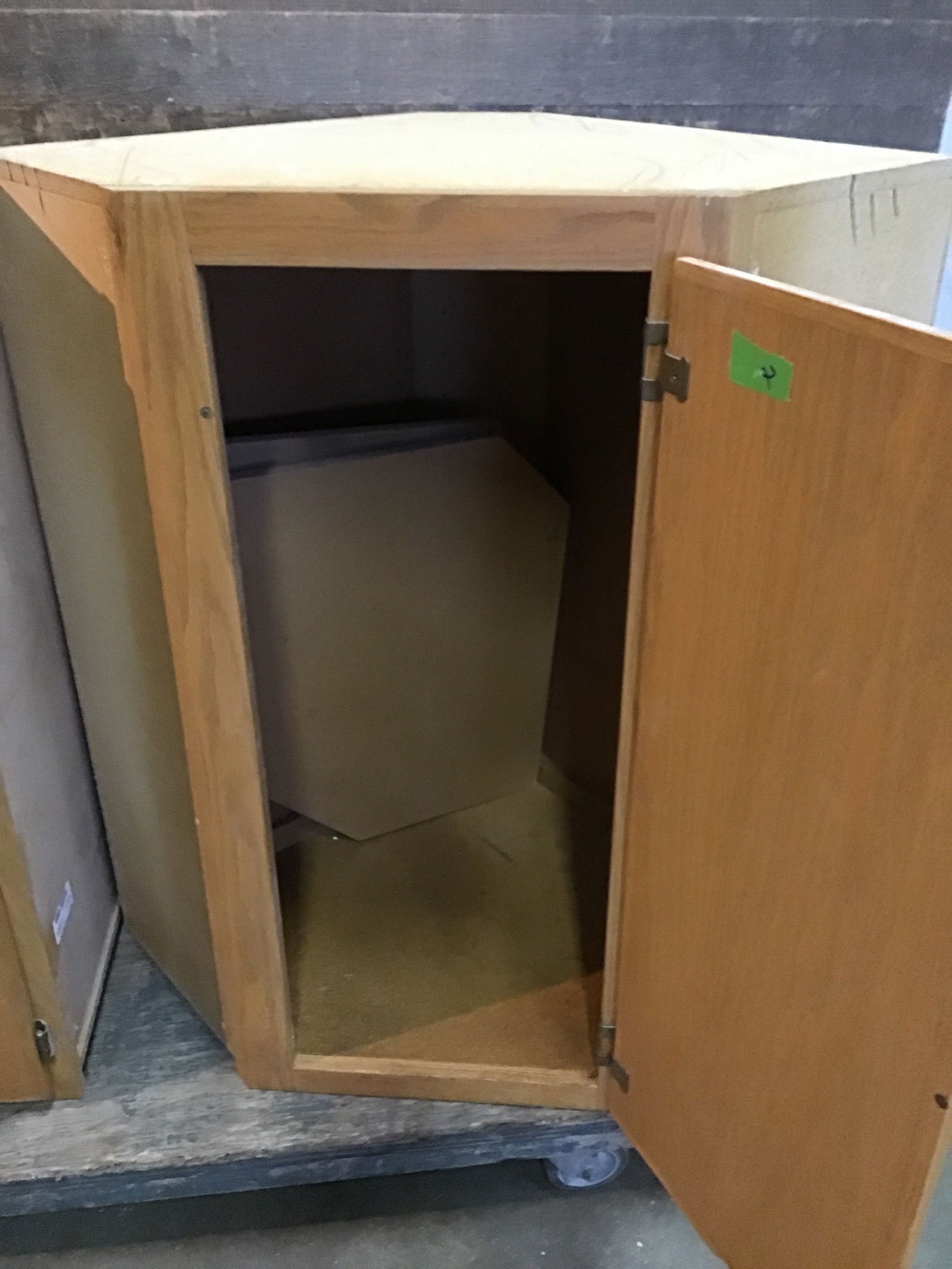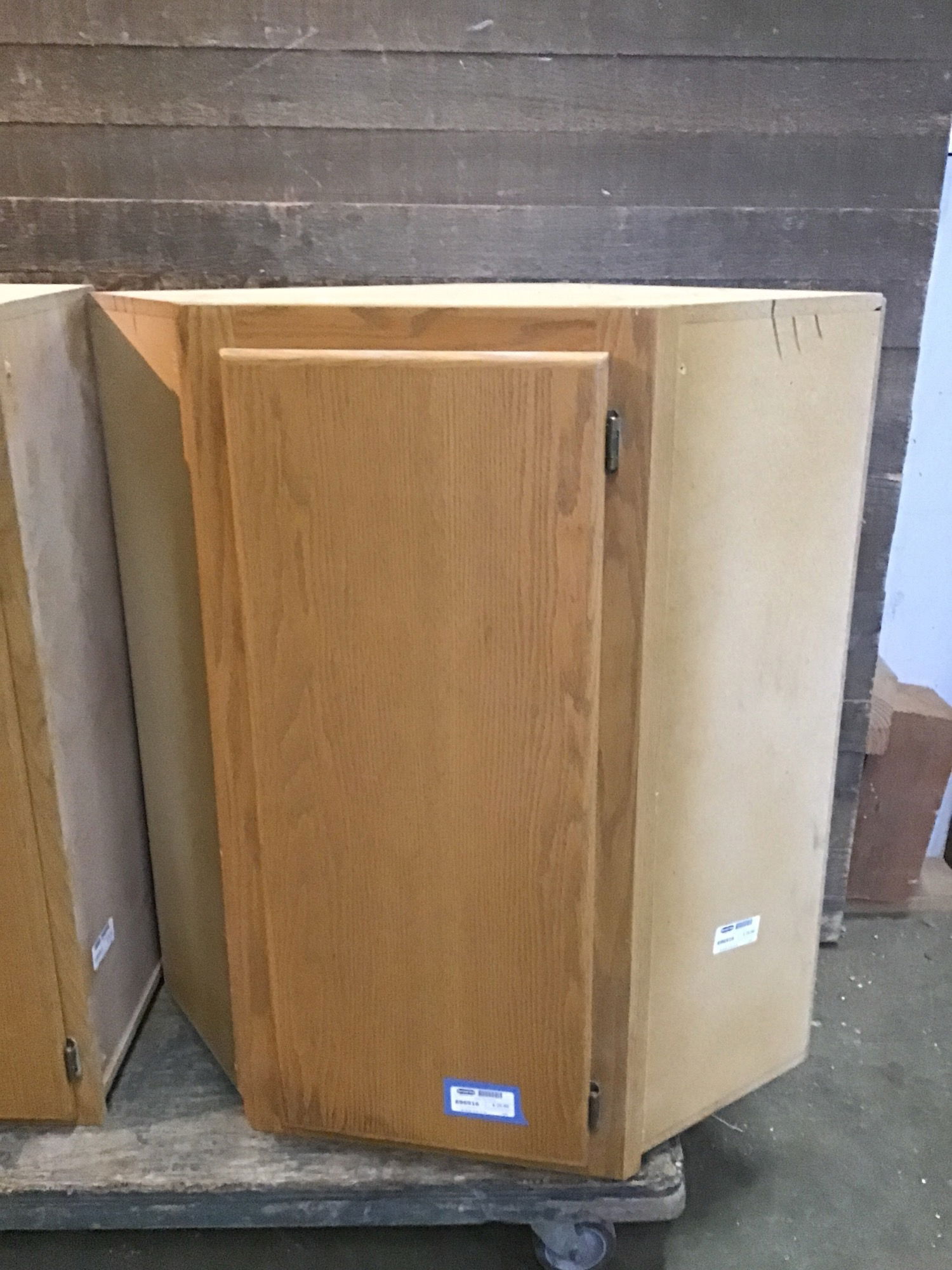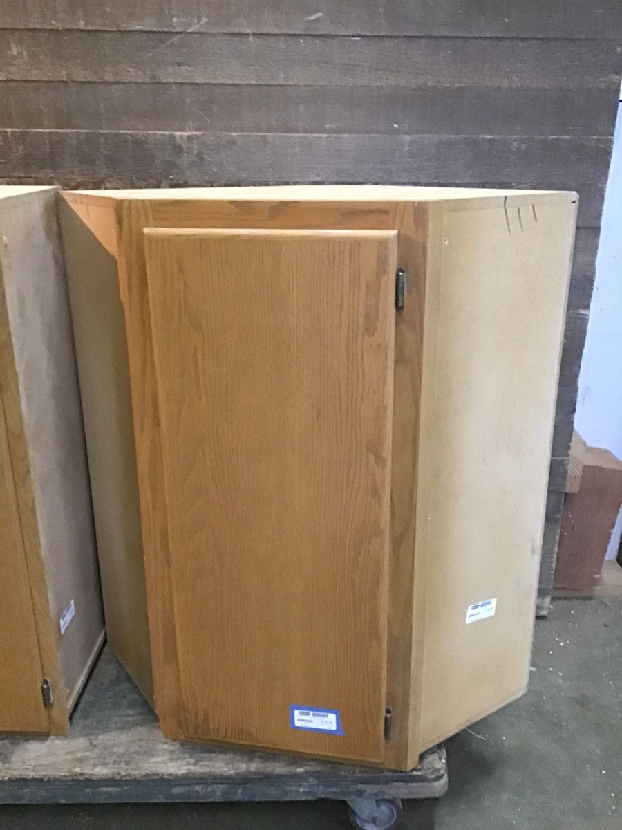 Corner upper cabinet, oak face, ply box with medium stain finish.