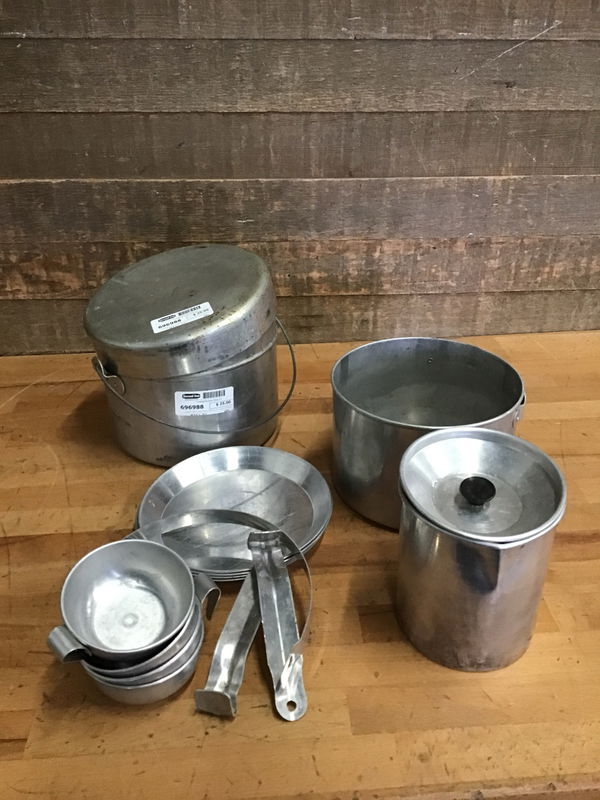 Vintage made in Italy bucket mess kit with various camping eating utensils including the body of the kit serving as a large soup pot.