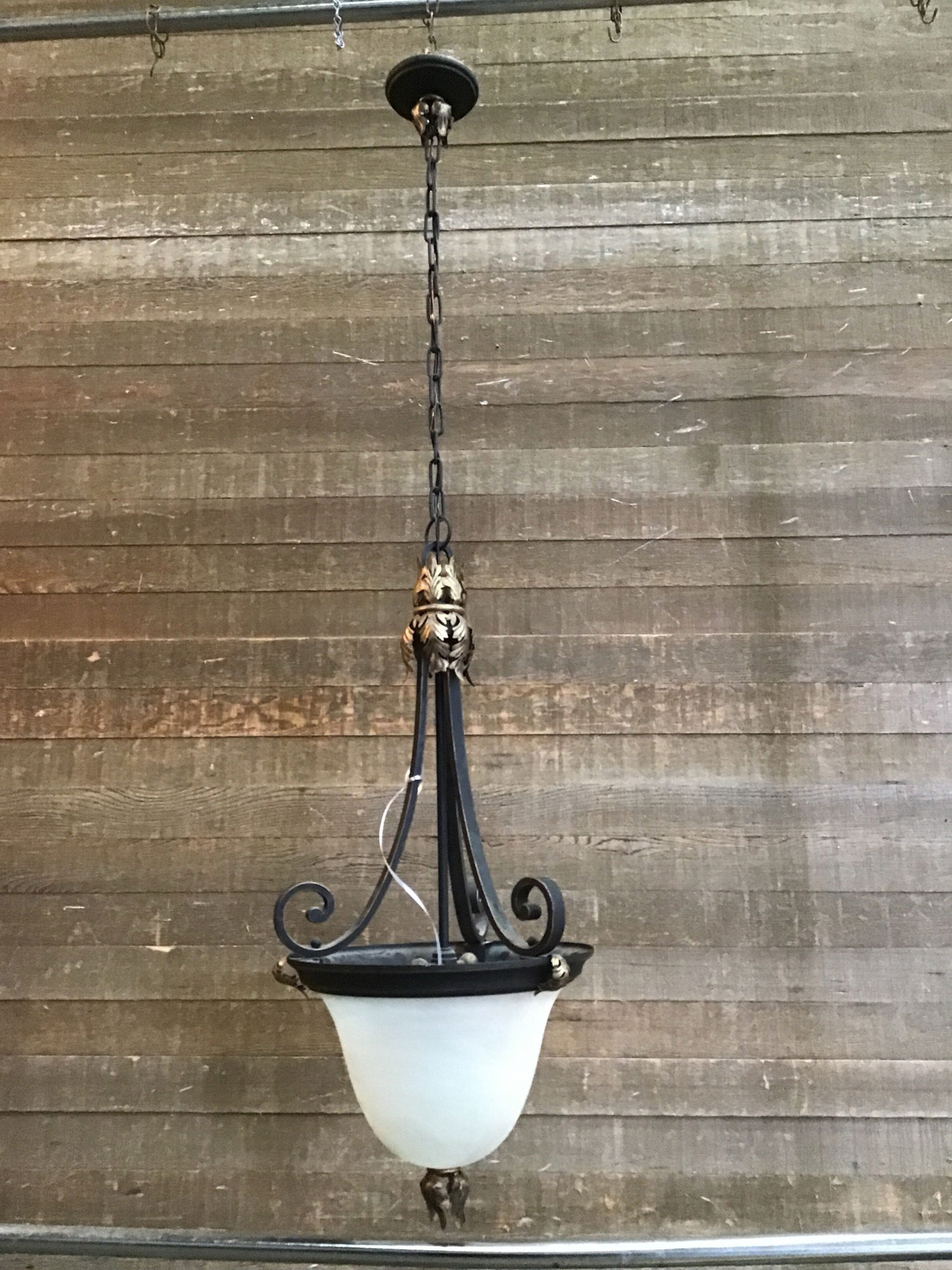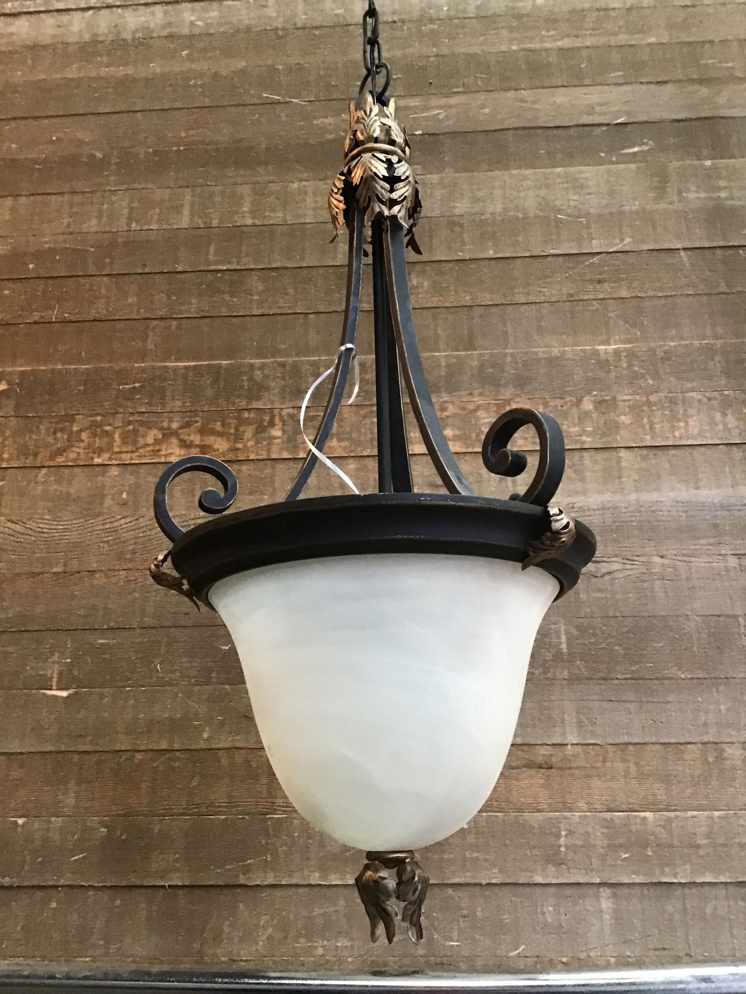 Previously installed Art Deco 2 Light Pendant. Oil rubbed bronze, with lots of leafy garnishes. Light fixture is 32" tall with an adjustable chain of 21", giving about 50" total height at the moment. Could use a good cleaning. Price reflects condition.