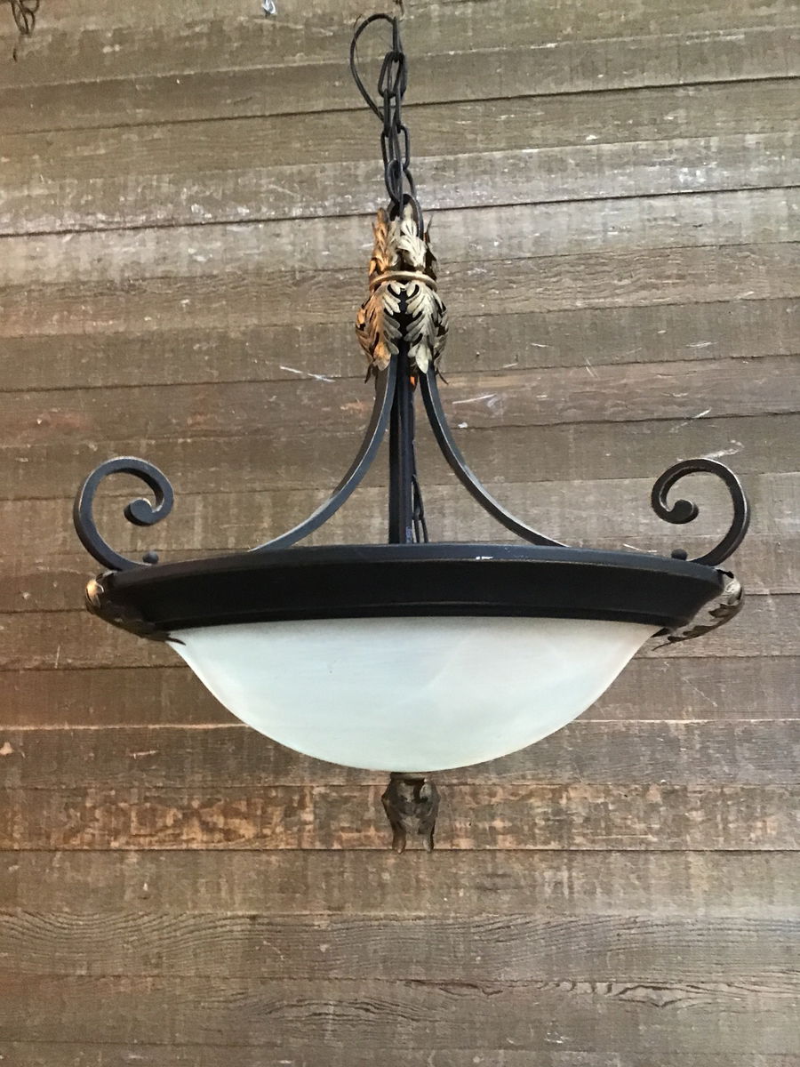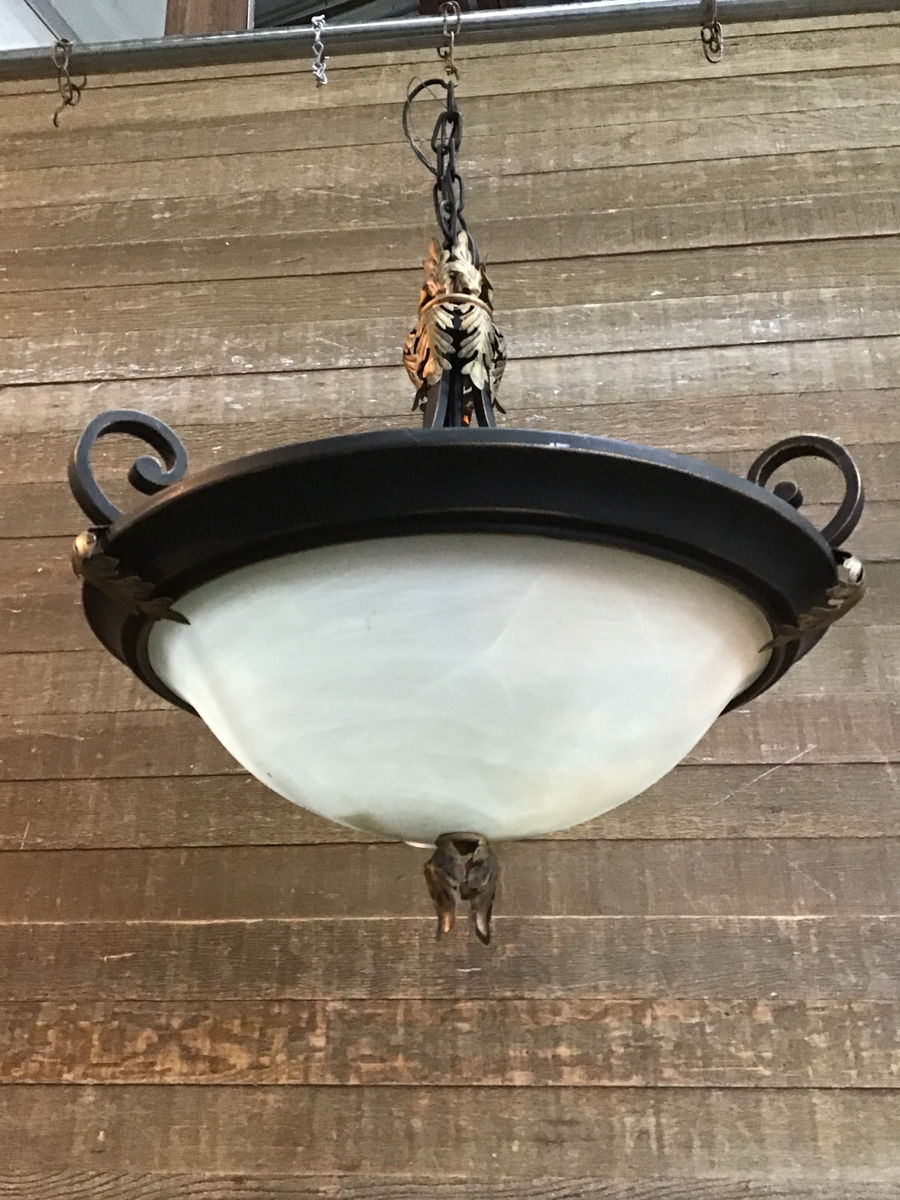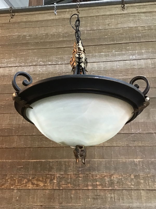 Previously installed Art Deco 3 Light Pendant Fixture. 32" adjustable chain with a 26" body, giving a total of about 58" overall height in its current configuration. Lots of swoopy deco lines and leafy garnishes. Price reflects condition.