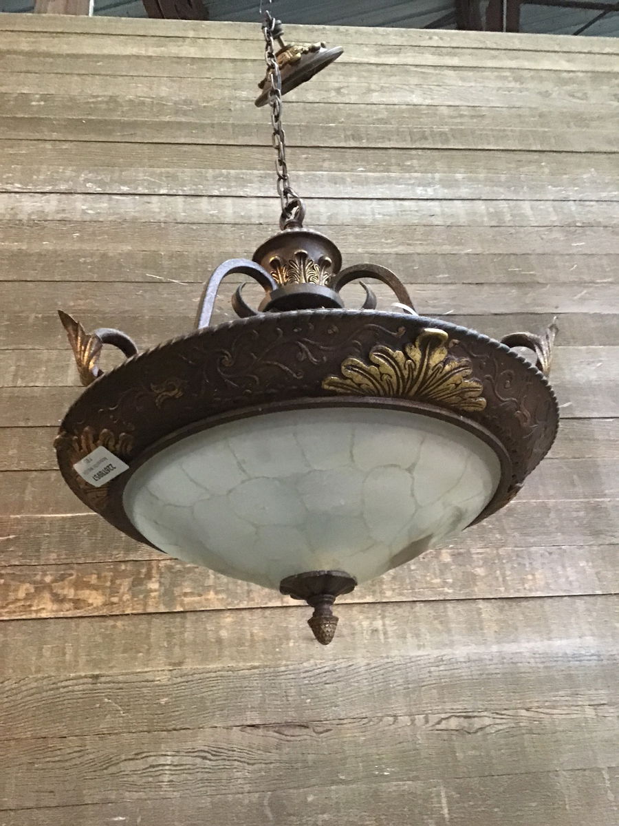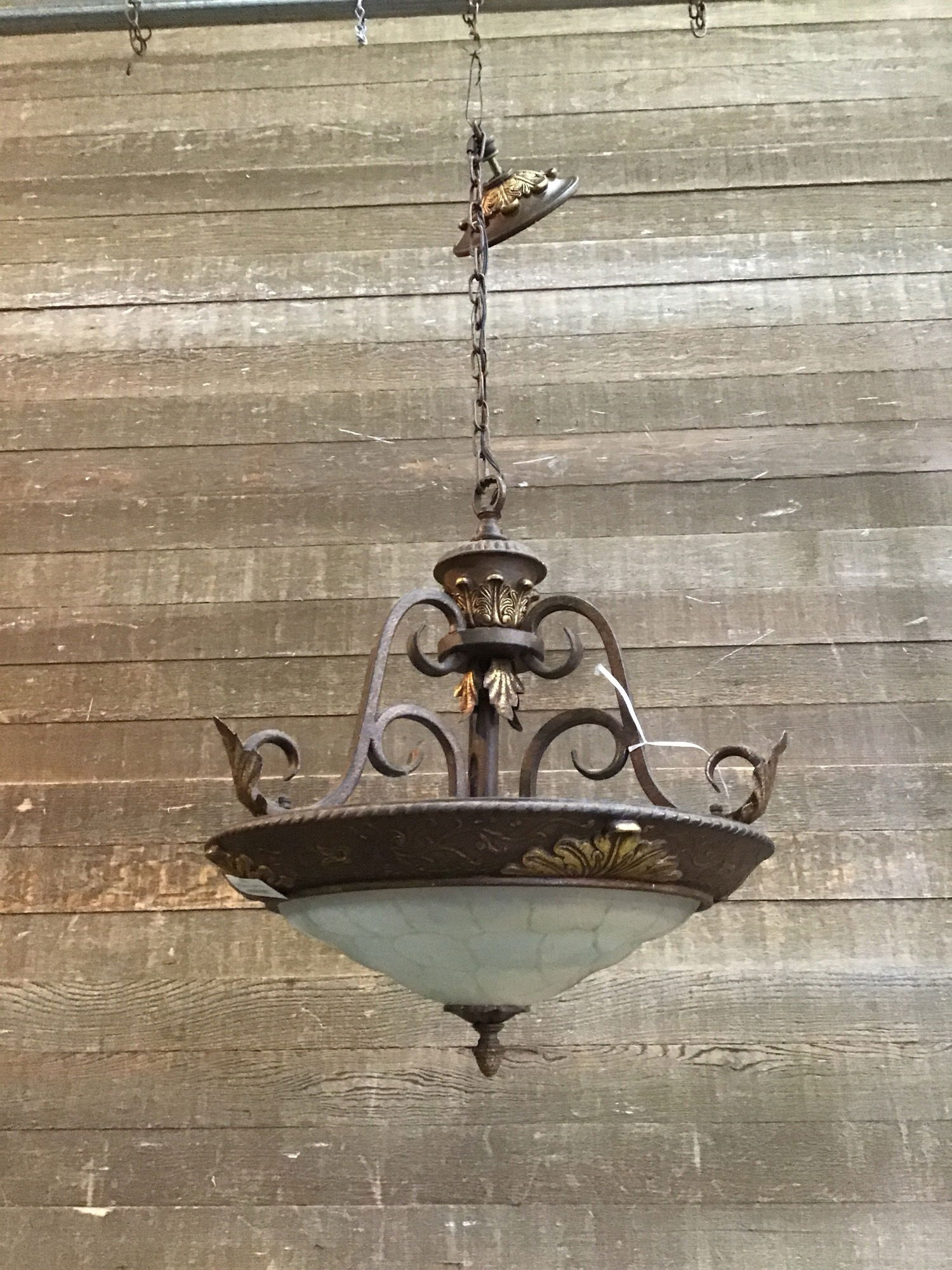 Previously installed Aged Bronze Inverted Pendant 3 Light fixture. Art Deco vibes, leafy garnishes, wow. Adjustable chain currently at 18", with total height being 42". Accentuate your tall ceilings with some regality. Could use a good cleaning, price reflects condition.