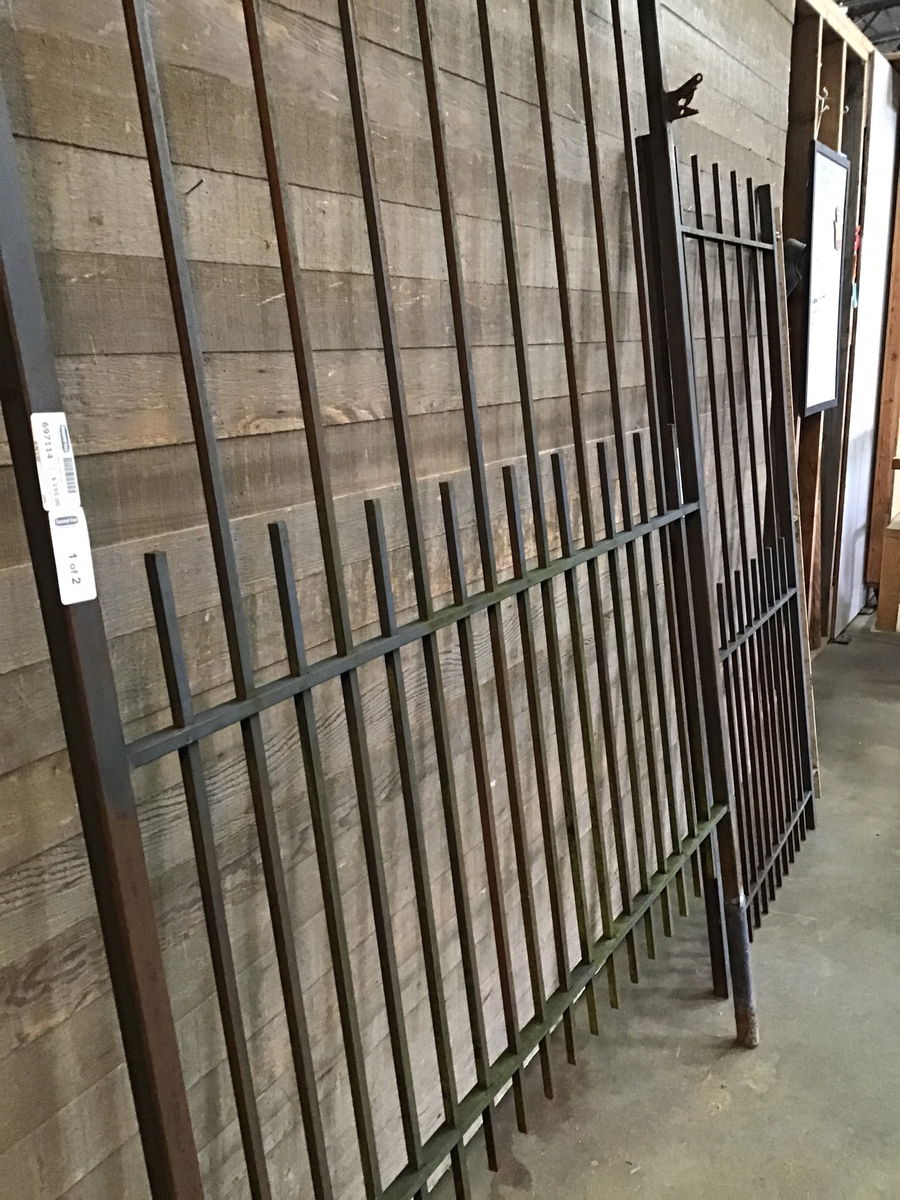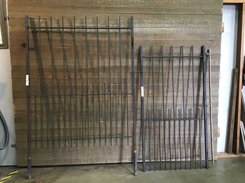 Large Steel Gate. Likely from an exterior entry way to a courtyard or walkway. The fixed (in ground and bolted to wall side) is 57" wide, and the gate door is 40" wide. Height on the stationary side is 74" once installed, and the gate door is 70". The door is hinged and was previously bolted in. Latch has slots for a padlock.