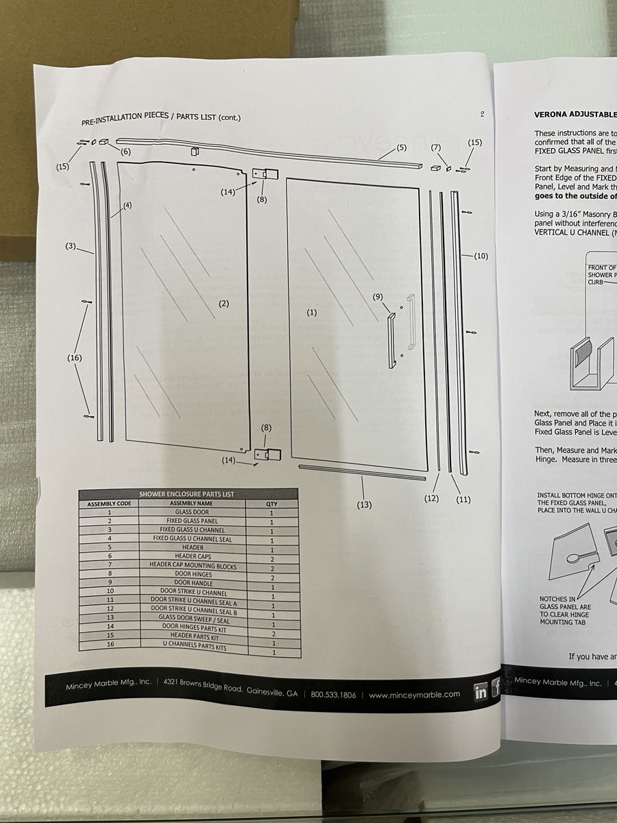 New in box, adjustable hinged shower door by Mincey Marble, the Verona line. This shower door comes with a matte black frame and hardware and includes two 3/8" thick pieces of tempered glass. See this link for specs and more info. This is a bulk item, no holds please. First photo is represented from their website and shows a different color finish than matte black. Photos may be representative.