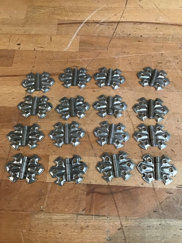 Sixteen Vintage cabinet hinges with a chrome finish. Some have some minor surface rust and paint on them though it shouldn't be too hard to clean em up or paint them.