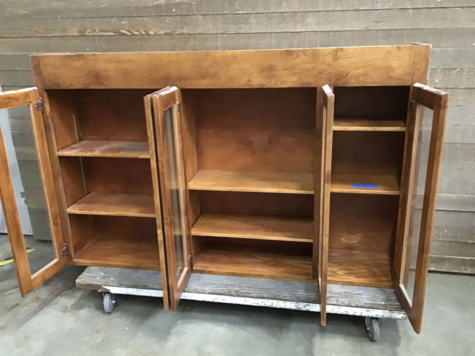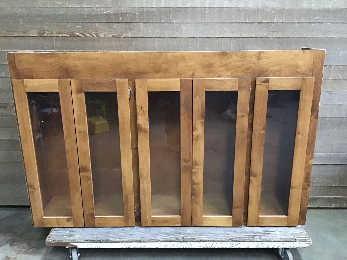 Nice built in upper cabinet with four glass doors, six adjustable shelves, and a warm stained wood finish. Built with a plywood box. Overall clean and good, used condition.