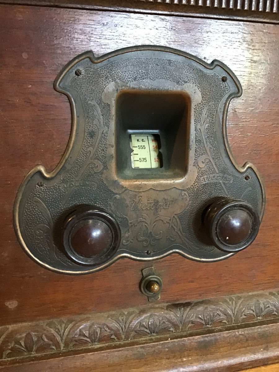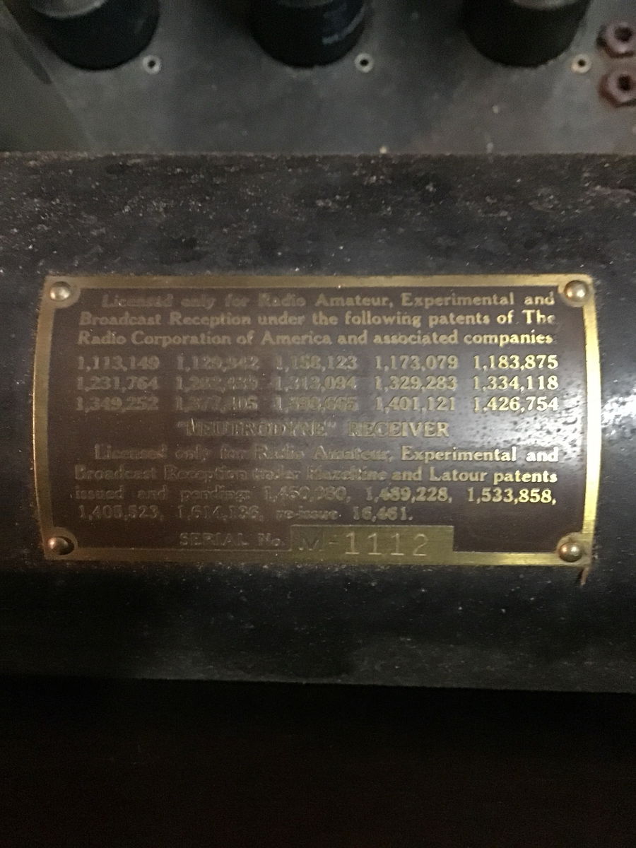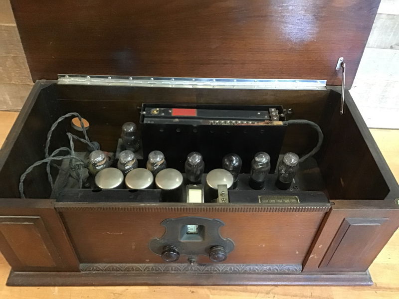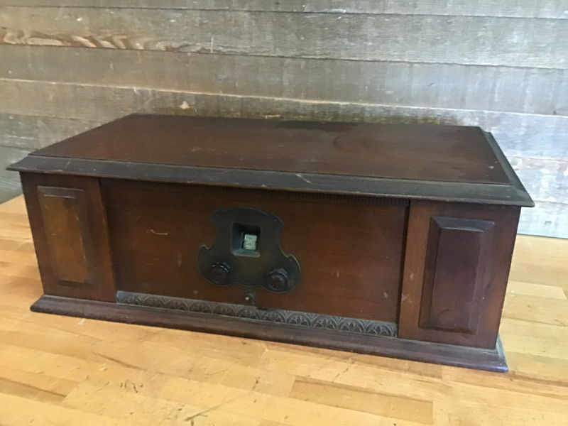 Vintage Neutrodyne Receiver, model M-1112. Looks to be in good condition. Powered on in house, it took a bit, but all the bulbs appeared functional although I was unable to get any sound out. Would be a great project for any radio enthusiasts out there.