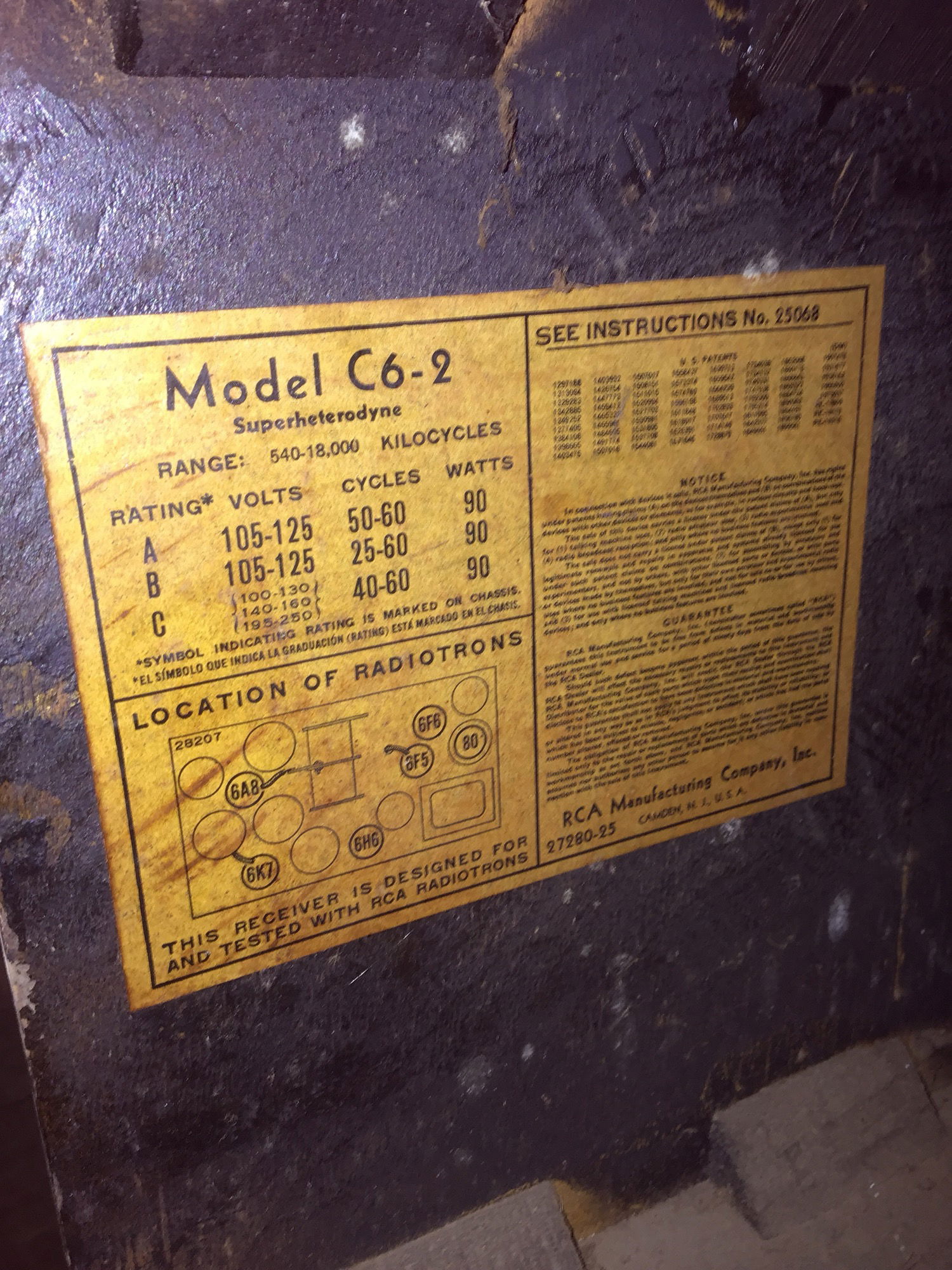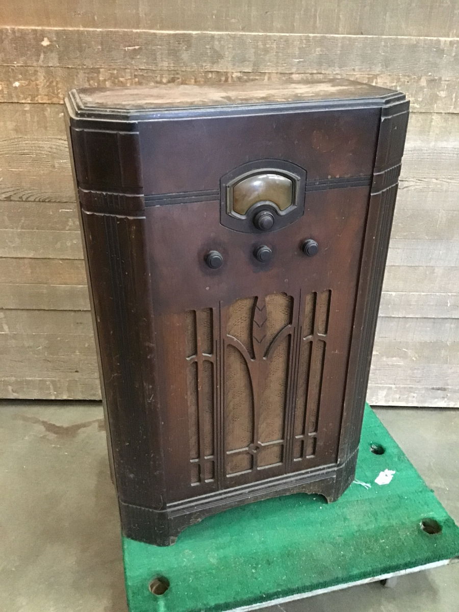Vintage RCA Victor floor standing radio, model C6-2. Powered on in house and dial panel lit up and bulbs seemed to be functioning, though we were unable to catch a signal and only got occasional static. The front and sides are in decent condition, but the top could use some love. Overall for it's age it's doing alright. Would make a great statement piece or a DIY project.