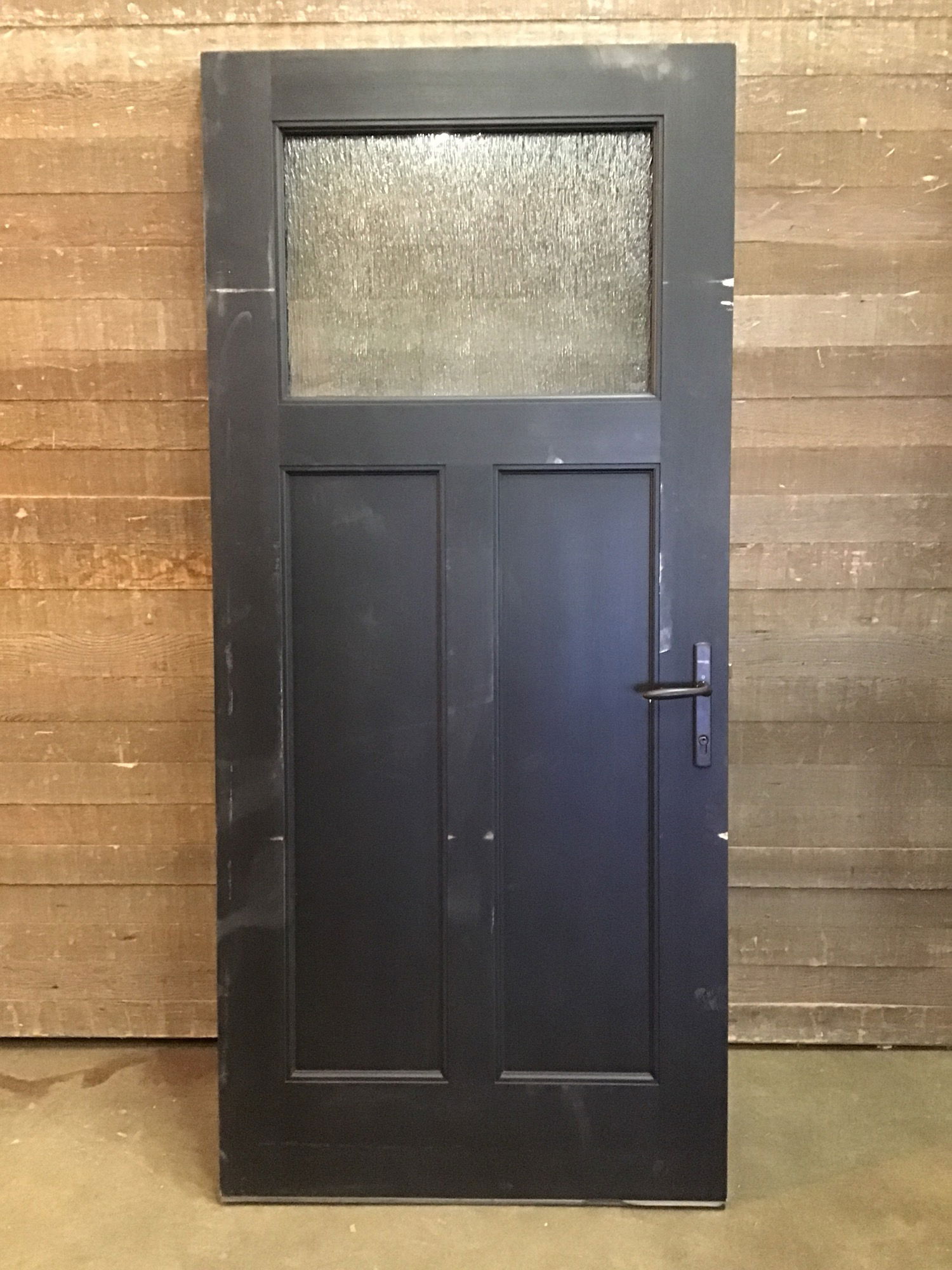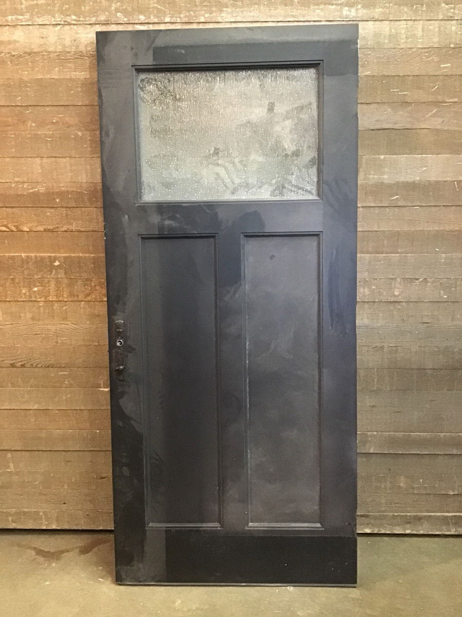 New, never installed, 36" ThermaTru Fiberglass exterior door with a 1/4 lite at the top and two recessed panels below the light. This door is black fiberglass with a Fir wood grain texture. Glass is tempered and thermopane with an obscured rain texture. This door comes with weatherstripping and hardware, but is missing one of the handles, and it looks like the lock/deadbolt is out of place and needs adjustment. Comes with key available in back upon purchase. Left hand swing hinge cuts. There are some scrapes to the composite face, that should be fairly easy to putty and color/grain match. Price reflects imperfections.