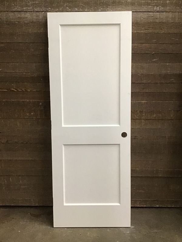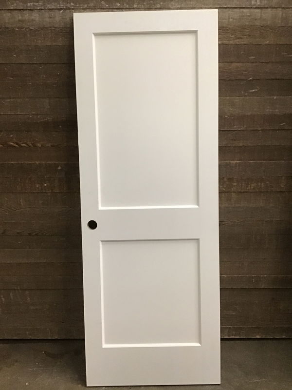 Primed MDF two panel interior door with right hand hinge cuts. Never installed before though may have some marks. Nothing that wouldn't go away with its first paint job. One side looks to have been cut shorter by an 1/8th of an inch.