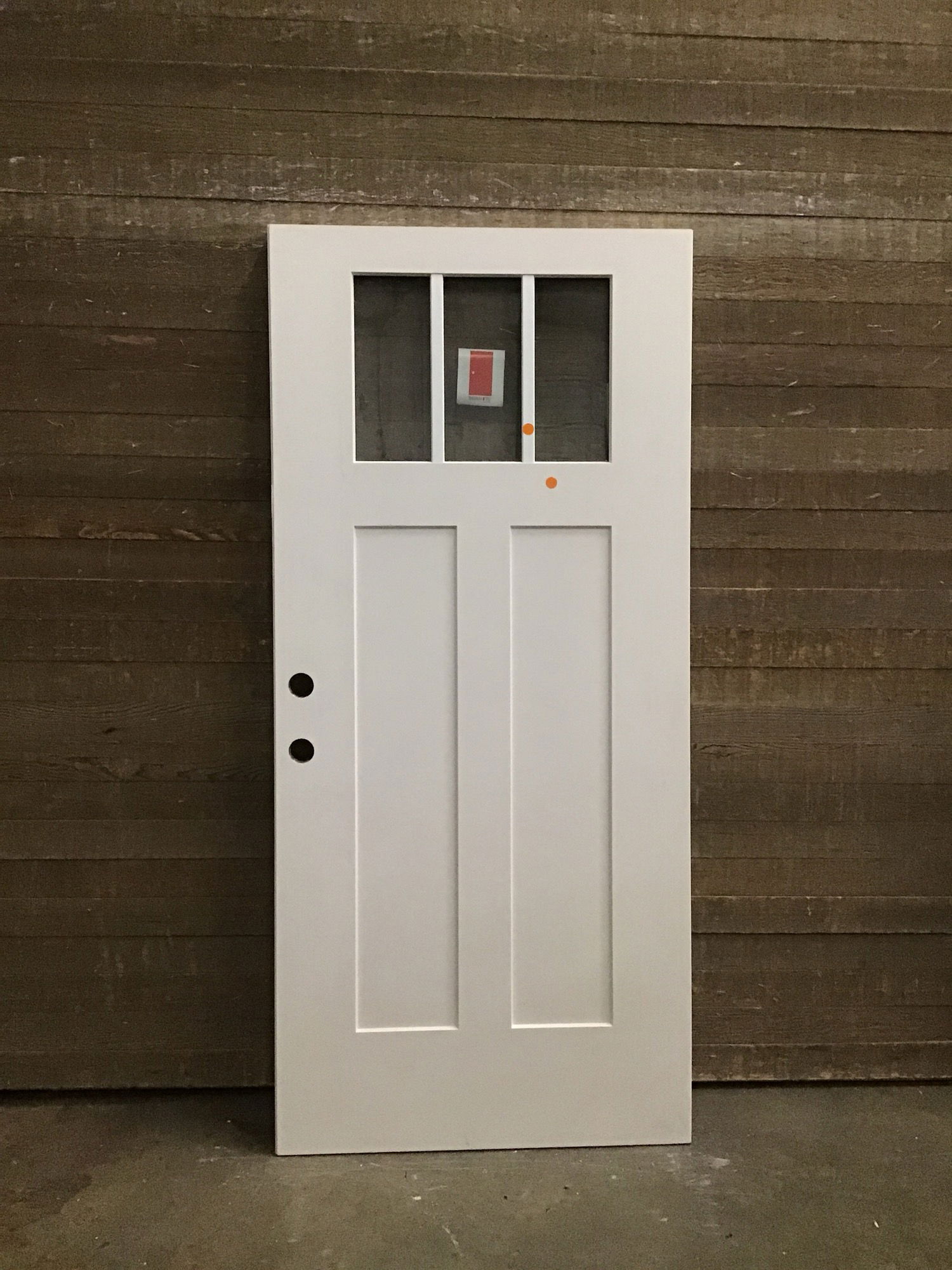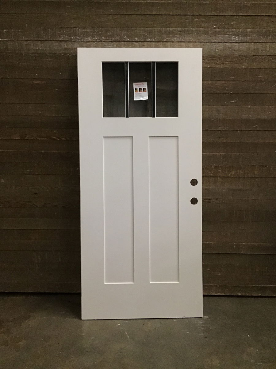 Fiberglass clad exterior door with Thermatru thermopane glass and some fake mullions to give it more character. Never installed, just has some marks and streaks that should disappear upon its first paint job.