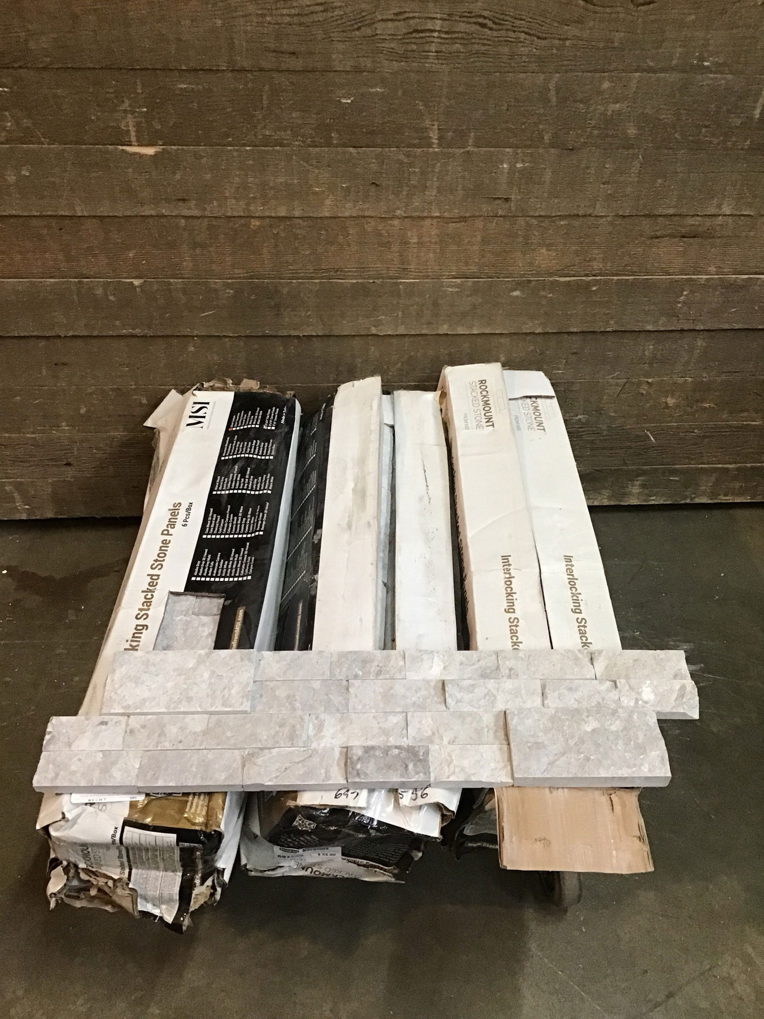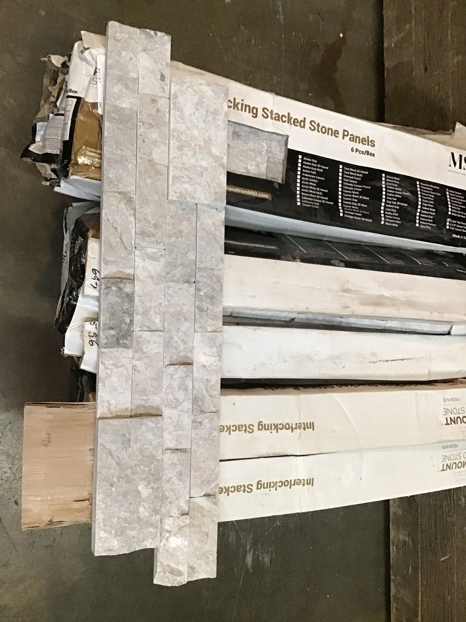 18 Sq Ft Lot of Rockmount Stacked Stone interlocking marble panels. 6" x 24" in "Silver Canyon". 18 pieces in total.