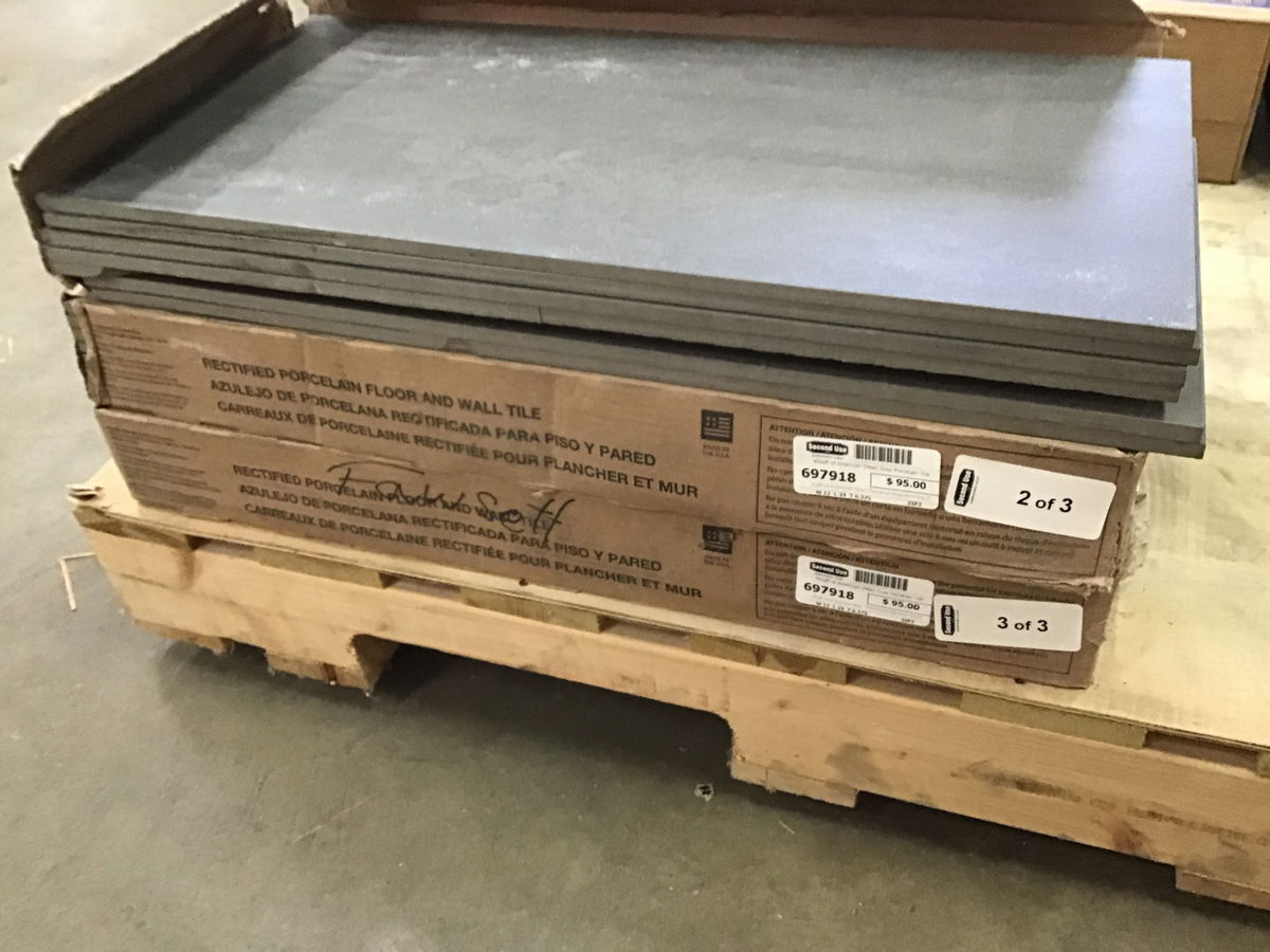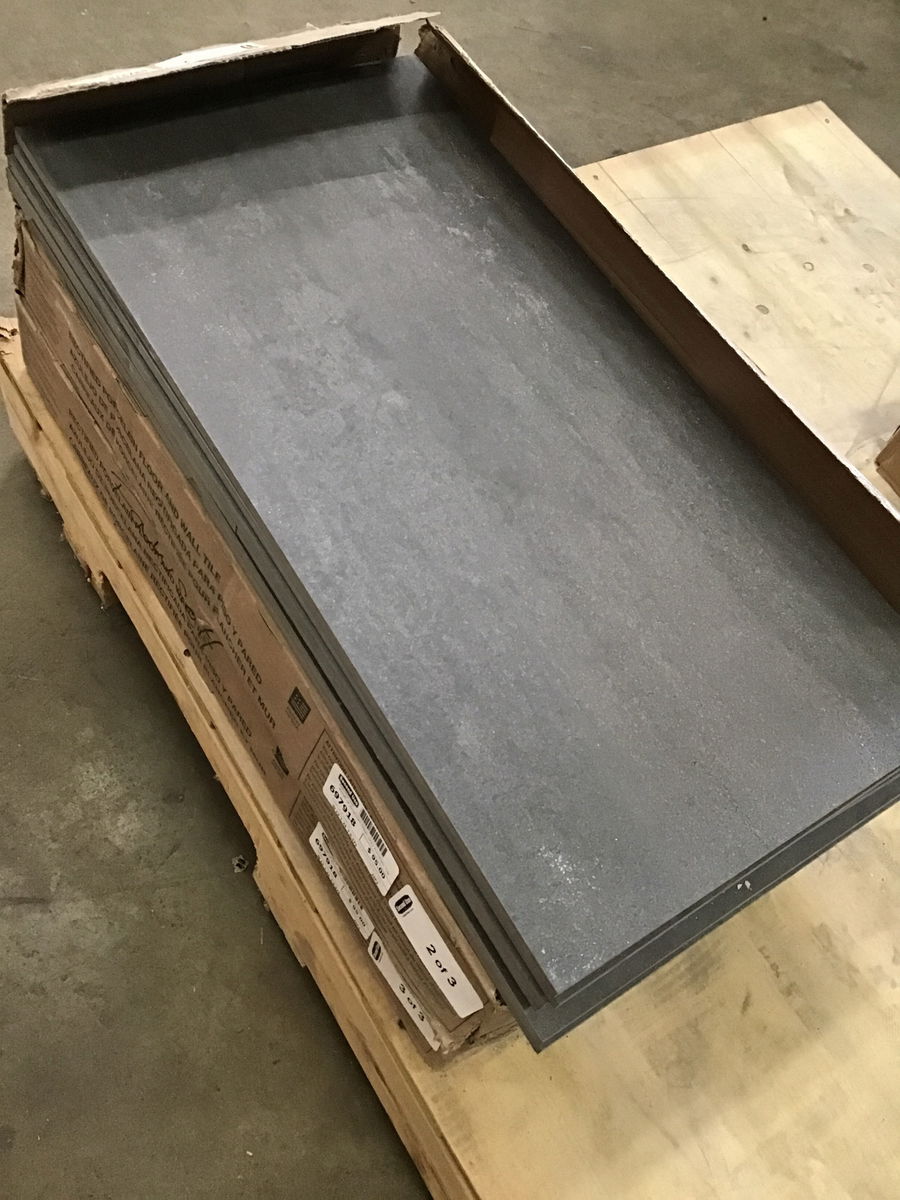 45sqft lot of American Olean "Theoretical Imaginative Gray Porcelain Tile." 3 boxes. 8 tiles per box. 15.12sqft per box. Price reflects some minor cracks I saw on a couple tiles.