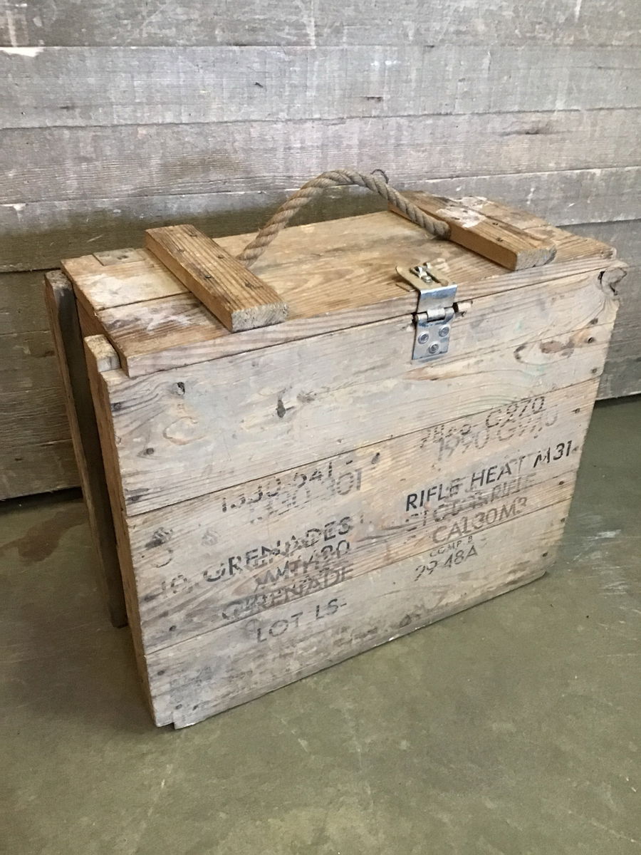 Wood slat ammo crate in good shape. Comes with hinged lid and rope handle. Great for folks who collect military memorabilia or for those who love a crate for storage.